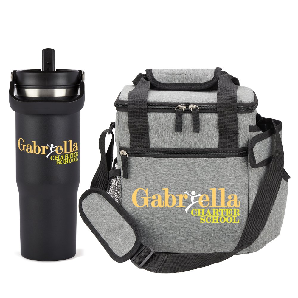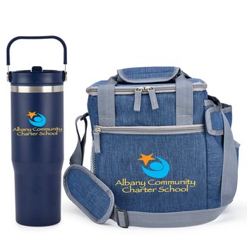 2-piece gift set includes: Coldflow Double-Wall Flip-Straw Bottle 30 oz. With Carry Handle & Riverside Deluxe Lunch/Cooler Bag With 30-/40-oz. Tumbler Pocket
