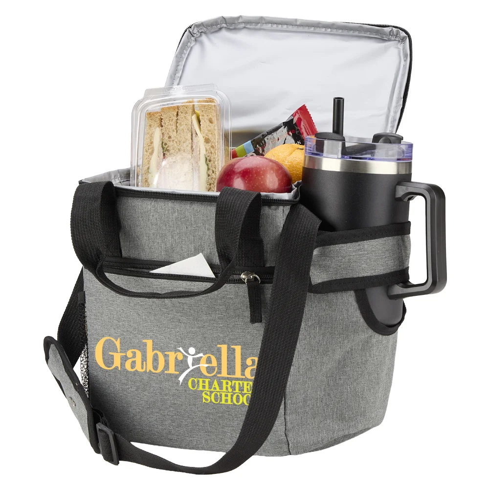 Personalized Lunch/Cooler Bag: Dual-zip, insulated main compartment keeps contents colder (or warmer) longer; Mesh pocket inside lid; Front zip pocket stashes napkins and other items; Side mesh pocket for a water bottle, utensils, and more; Additional adjustable side pocket totes up to a 30-/40-oz. bottle or tumbler; Two carry options: comfort-wrapped handles or padded, adjustable shoulder strap; Holds up to 9 cans; ID window on back; Heathered 600-denier polyester