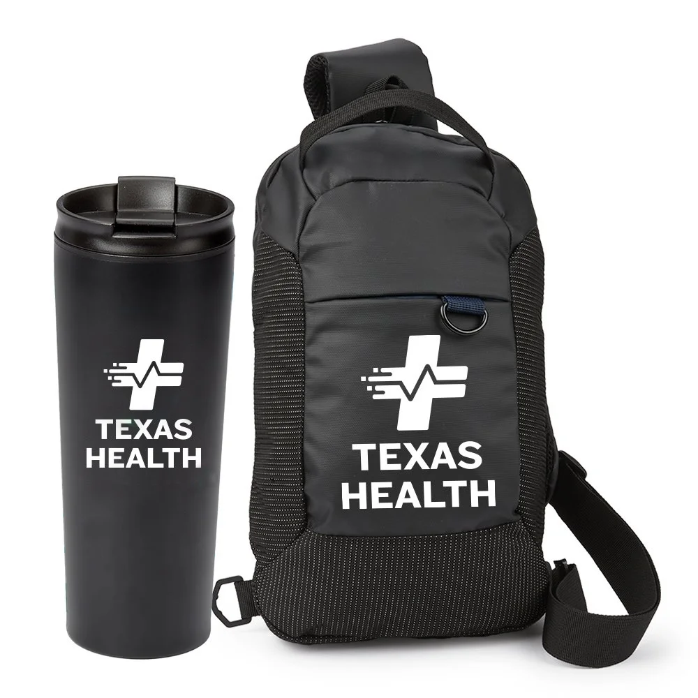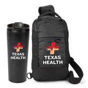 2-piece gift set includes: Harley Crossbody Sling Bag & Sleek Stainless-Steel/Plastic Tumbler With Dual Lids 24 oz.