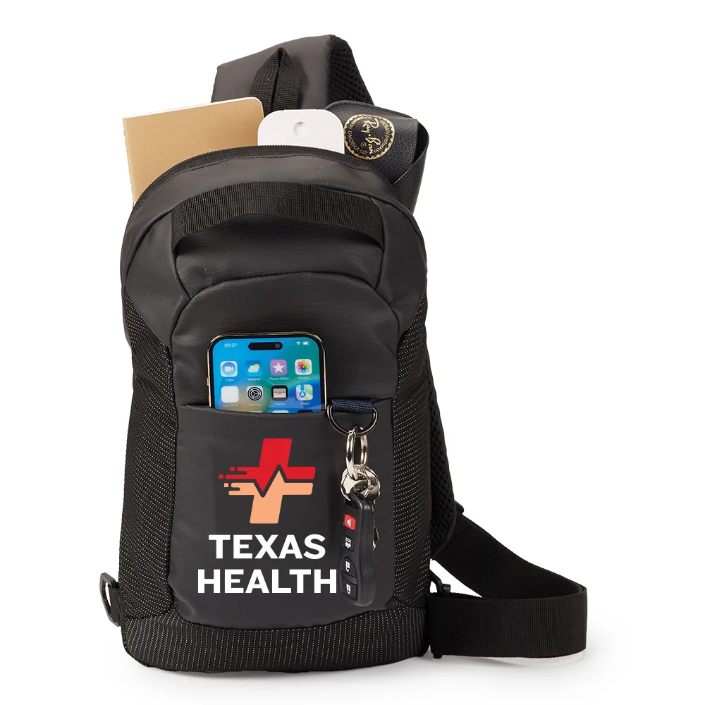 Personalized Crossbody Bag: Large, zippered main compartment; Secure front pocket, internal accessory clip, and exterior D-ring optimize organization; Padded mesh back panel for comfort; Durable jacquard fabric: 600-denier and 210-denier polyester with blue lining and protective PE foam padding; Textured, water-resistant exterior; Ergonomic, padded, adjustable comfort strap clips to left or right side; Top grab handle for in-hand carry