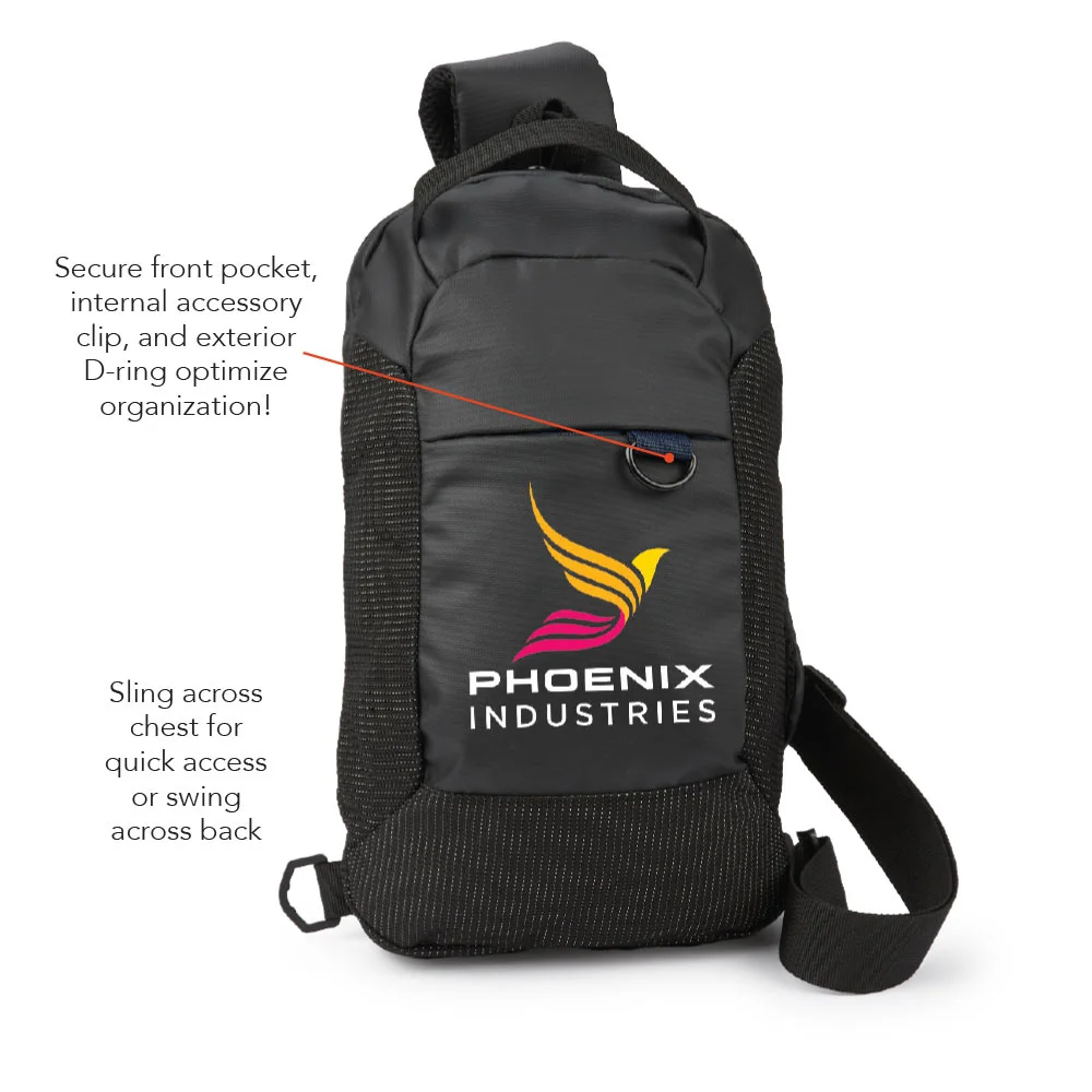 Personalized Crossbody Bag: Large, zippered main compartment; Secure front pocket, internal accessory clip, and exterior D-ring optimize organization; Padded mesh back panel for comfort; Durable jacquard fabric: 600-denier and 210-denier polyester with blue lining and protective PE foam padding; Textured, water-resistant exterior; Ergonomic, padded, adjustable comfort strap clips to left or right side; Top grab handle for in-hand carry