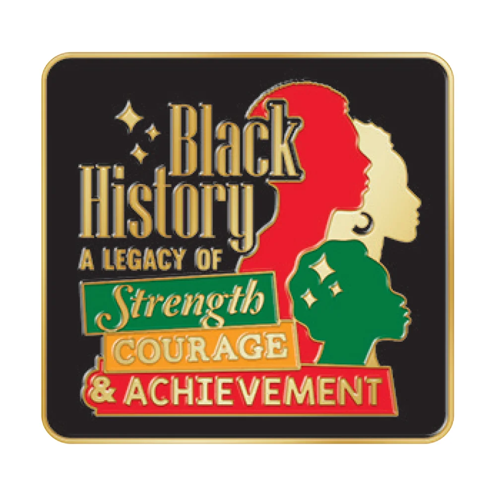 Bright metal Lapel Pin with glossy enamel finish features our exclusive Black History: A Legacy of Strength, Courage, & Achievement design