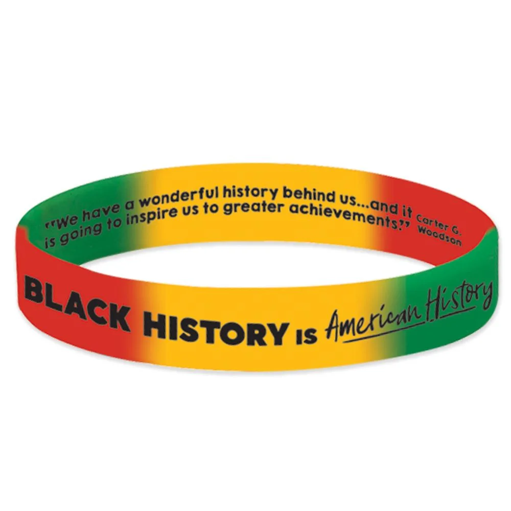 100 2-Sided Silicone Bracelets: Inside displays a quote from historian Carter G. Woodson; Latex-free, PVC-free, lead-free silicone; Fits all wrists