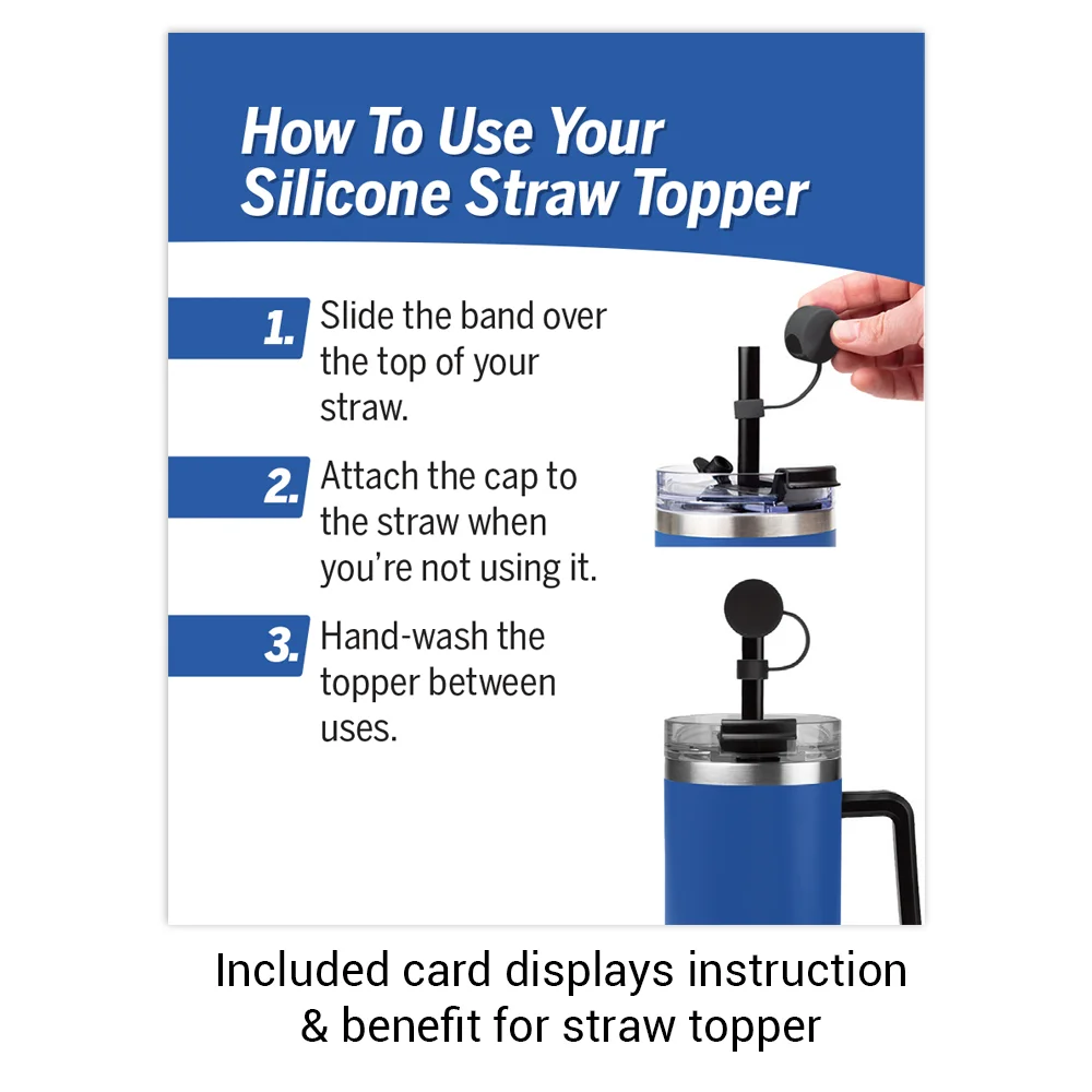 • Tethered topper cap keeps straw clean, stops spills, and won't fall off; Polybagged with instruction/benefit card