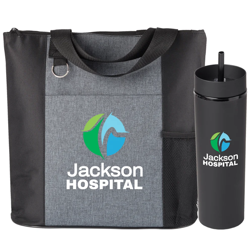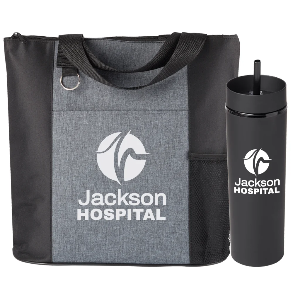 2-piece gift set includes: Camino Heathered Tote Bag & Canyon 2-in-1 Tumbler & Sipper 16-Oz.