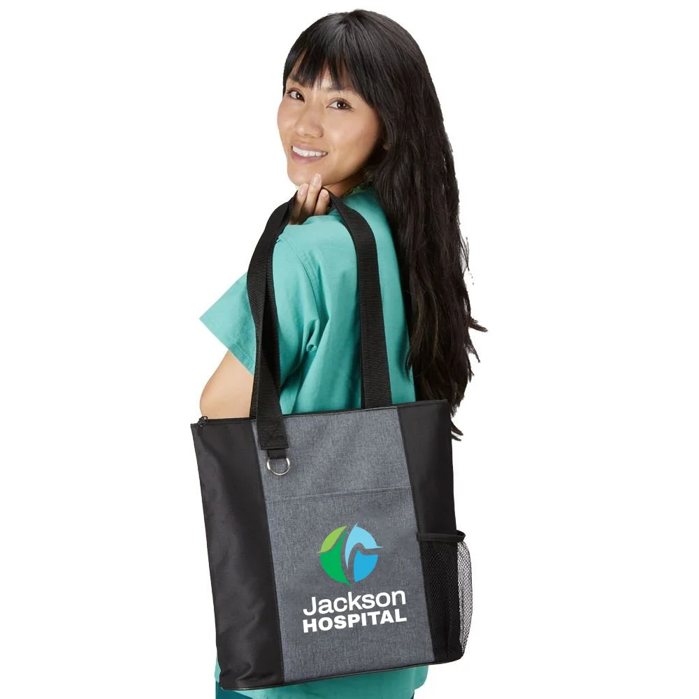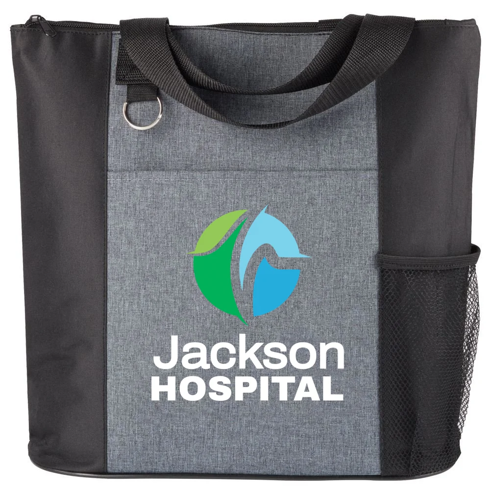 Personalized Tote Bag: Go-to reusable tote sized just right to hold weekday essentials; Trendy, heathered, two-tone styling; Top zipper closure, front pocket, mesh water bottle pocket; Split ring attachment for keys; 26" handles; 210-denier polycanvas