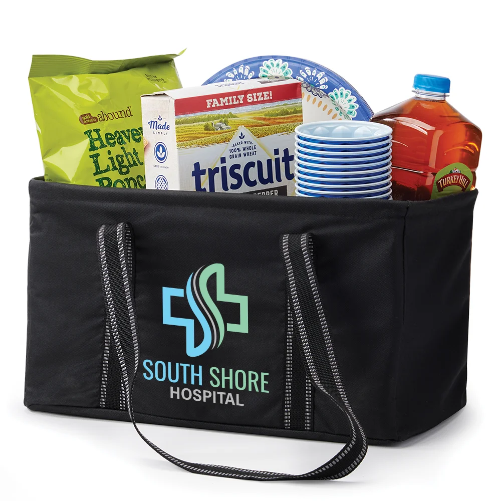 Personalized Tote: Large main compartment with wire rim to hold its shape; Collapses flat for easy storage; Stable base makes it easy to load and unload; Carries groceries, clothing, and daily essentials; Dual 33.5" black web carry handles; 600-denier polyester