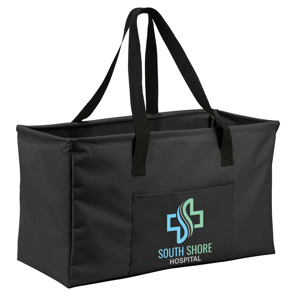 Personalized Tote: Large utility tote designed to meet all of your storage needs; Made of durable 600-denier polycanvas; Sturdy wire rim reinforcement for added support, structure, and stability; Extra-large open main compartment holds books, electronics, snacks, clothes, and more; 11" drop handles for easy carrying; Generous 9" gusset