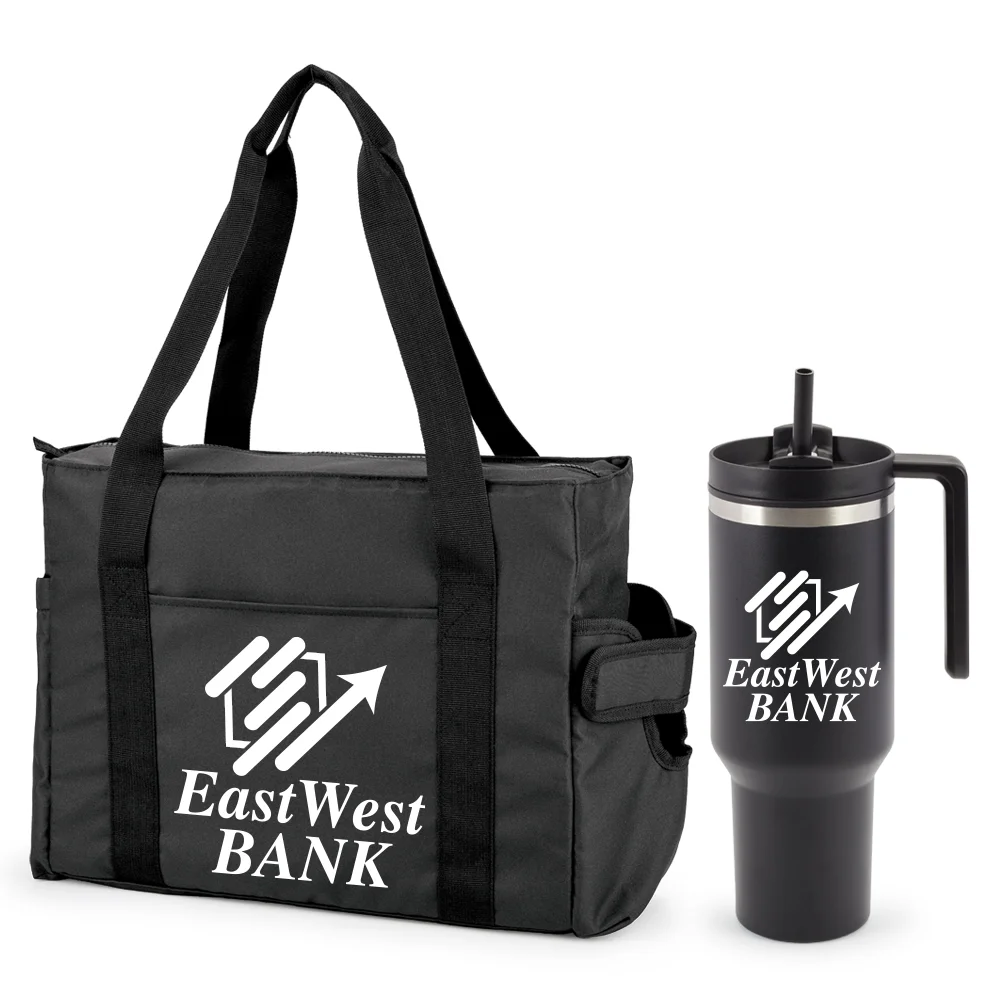2-piece gift set includes: Blake rPET Multipurpose 17" Computer/Laptop Tote Bag With 30-/40-oz. Tumbler Pocket & Trolley Strap & HydroSip Double-Wall Stainless Vacuum-Insulated Tumbler 30 oz. With Handle