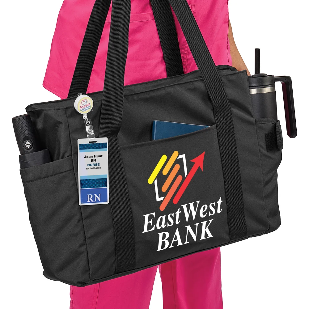 Personalized Tote Bag: Roomy zippered main compartment; Dedicated padded laptop sleeve fits most laptops up to 17"; Deep, adjustable Velcro side pocket for 30-/40-oz. drinkware with or without handle (not included); Additional side pocket on opposite end for an umbrella; Front and interior slip pockets for quick-access items; Dual carry handles for hand, arm, or shoulder carry; Trolley strap makes commuting and travel a breeze; Eco-friendly rPET material