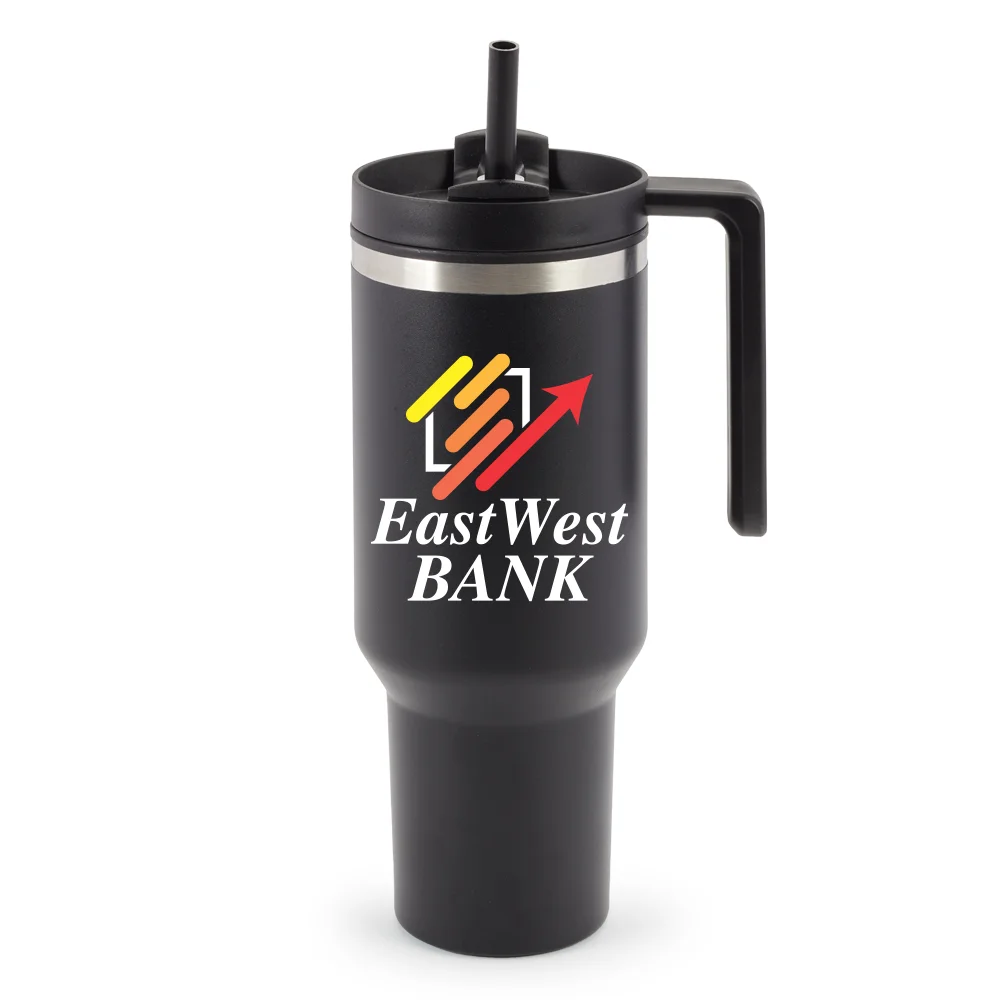 Personalized 30-oz. Tumbler: Double-wall, vacuum-insulated stainless steel; Keeps drinks cold for 24 hours and hot for 12 hours; Splash-resistant, screw-on lid with removable straw; 3-position rotating lid: fully sealed, straw opening, drink opening; Sturdy handle built into lid; Powder-coated finish; Non-slip bottom; Fits most car cup holders; Eco friendly; Reusable; BPA free; Note: Hand wash