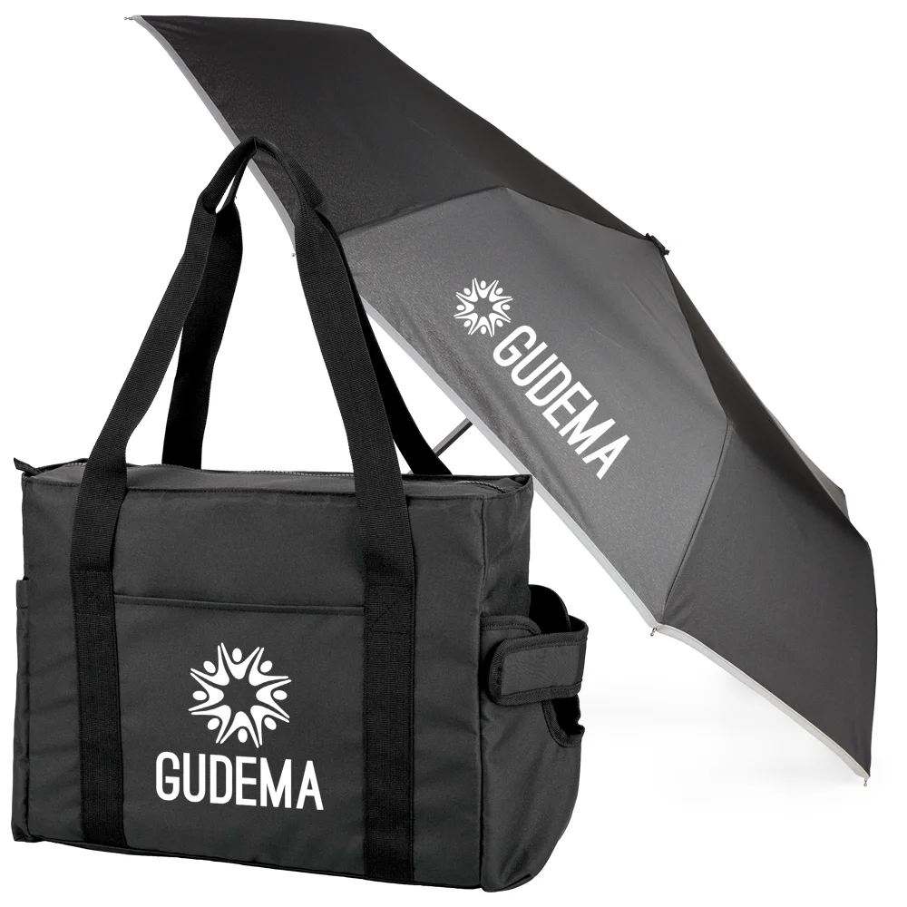 2-piece gift set includes: Blake rPET Multipurpose 17" Computer/Laptop Tote Bag With 30-/40-oz. Tumbler Pocket & Trolley Strap & 46" rPET/UV Auto Open & Close Umbrella With Reflective Trim & Carabiner Handle