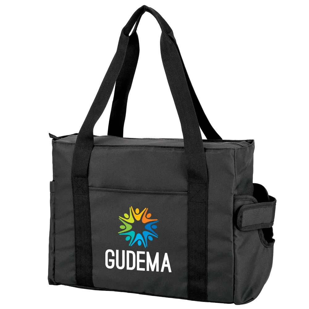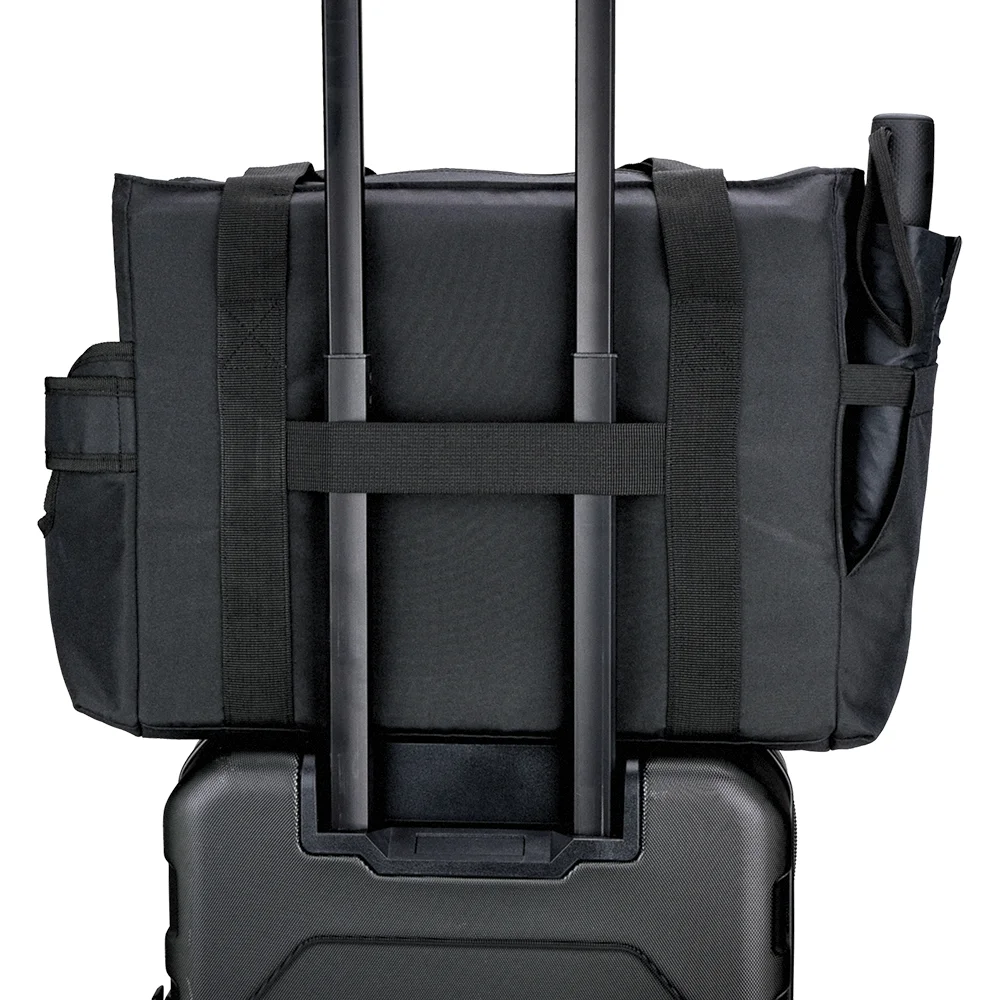 Personalized Tote Bag: Roomy zippered main compartment; Dedicated padded laptop sleeve fits most laptops up to 17"; Deep, adjustable Velcro side pocket for 30-/40-oz. drinkware with or without handle (not included); Additional side pocket on opposite end for an umbrella; Front and interior slip pockets for quick-access items; Dual carry handles for hand, arm, or shoulder carry; Trolley strap makes commuting and travel a breeze; Eco-friendly rPET material