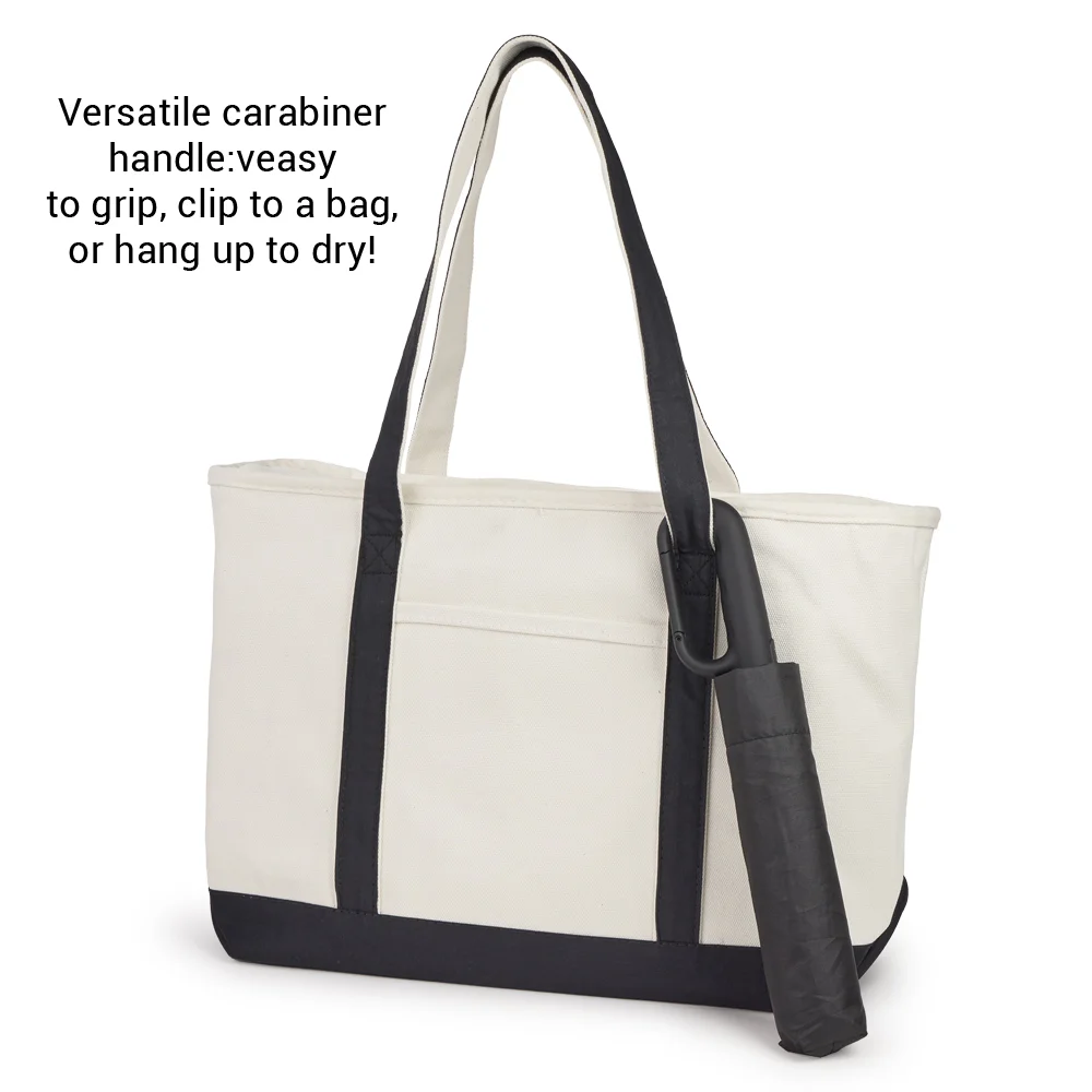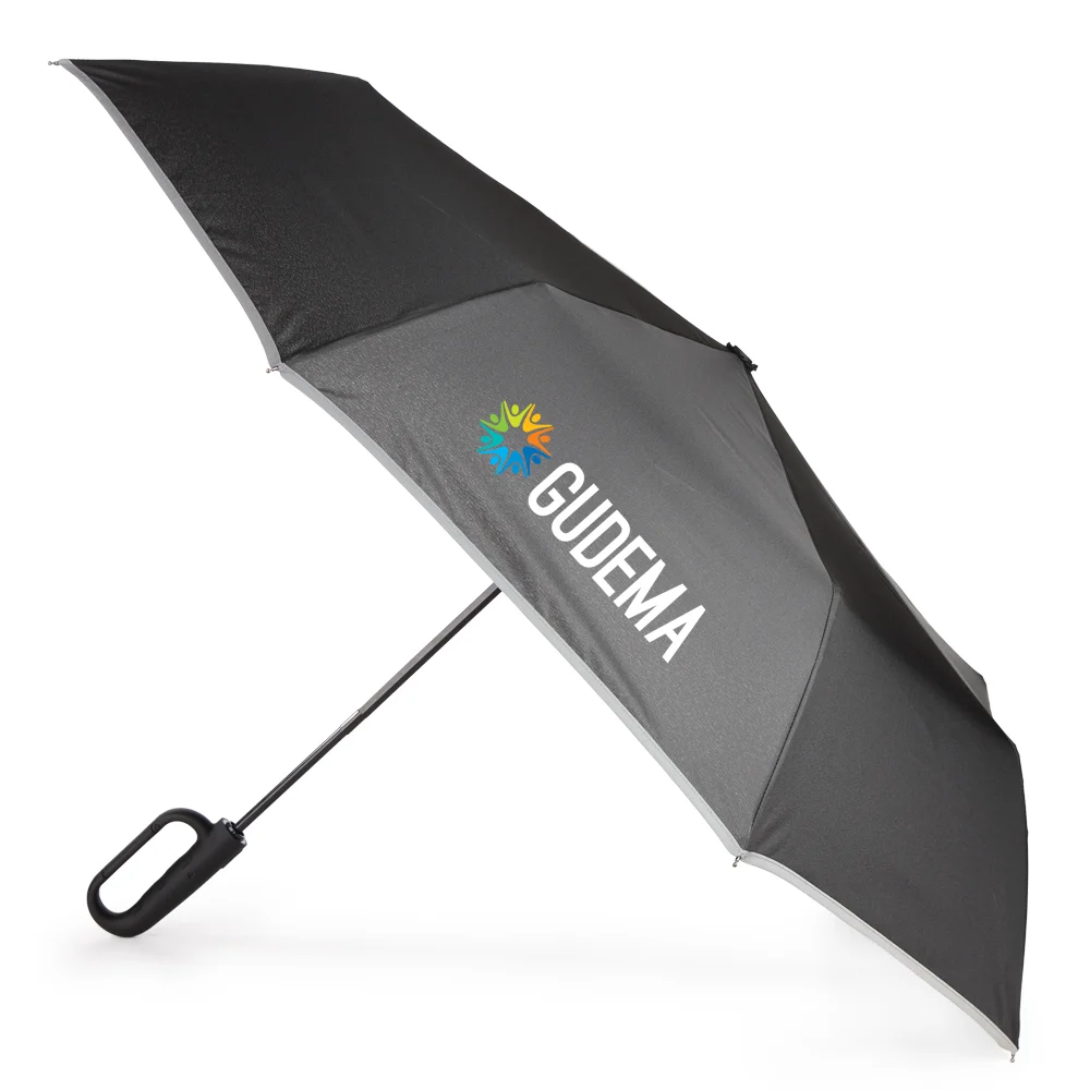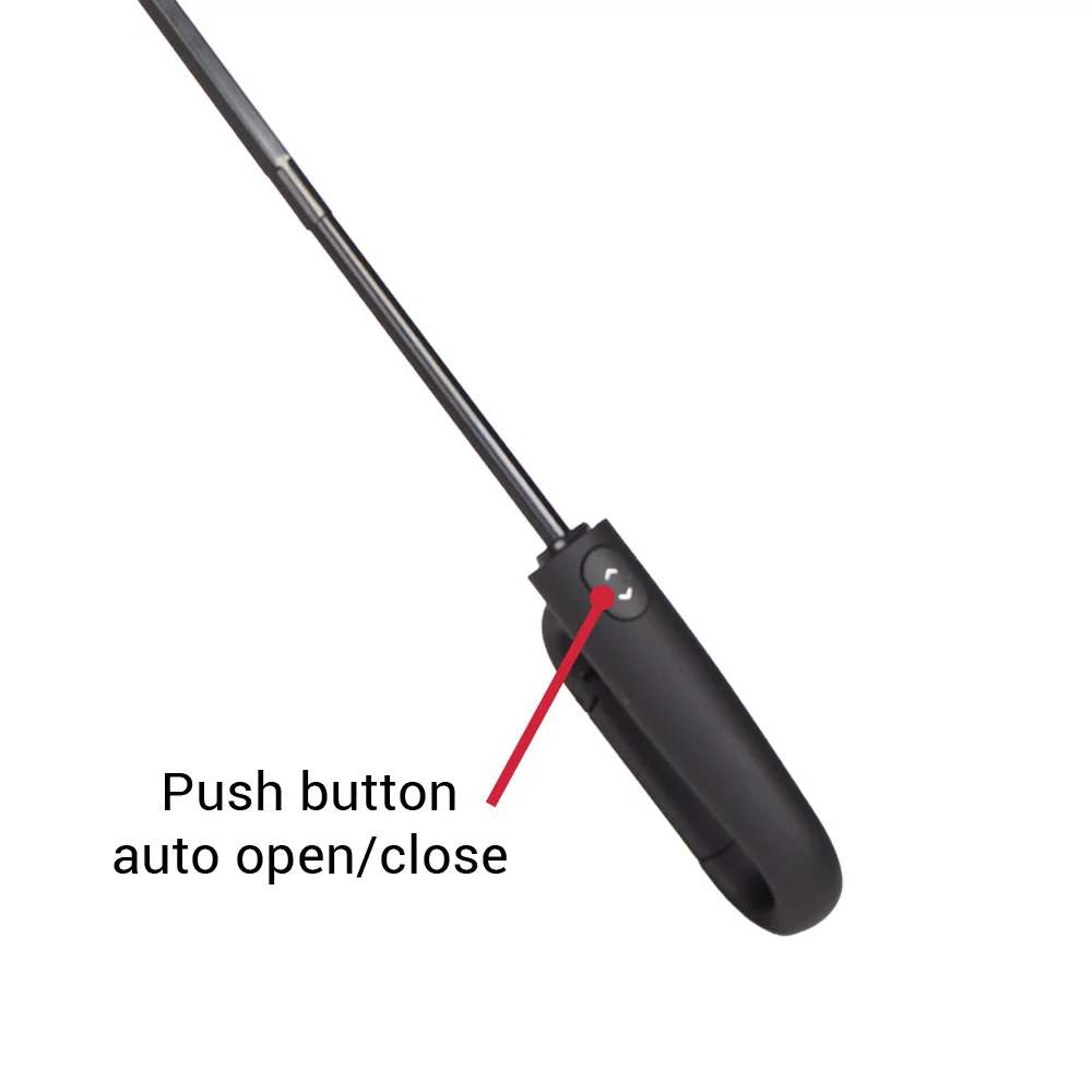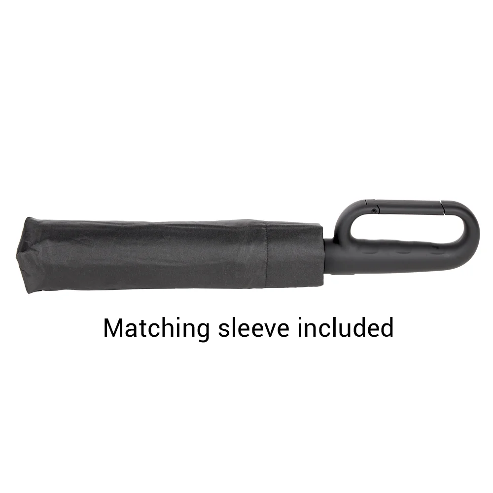 Personalized 46" Umbrella: 8 panels; 46" canopy arc; Fiberglass ribs and frames; Trim reflects street lights and headlights; Push button for one-hand auto open/close; Versatile carabiner handle: easy to grip, clip to a bag, or hang up to dry; Telescoping iron shaft folds for transport; Eco-friendly rPET 190T pongee; PFAS free; C-Zero water-repellent coating (no harmful chemicals); SPF-50 sun protection; High-visibility trim; Matching sleeve included