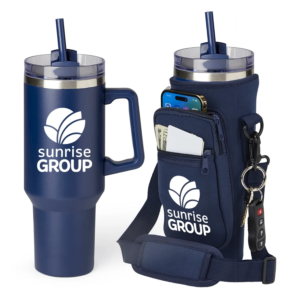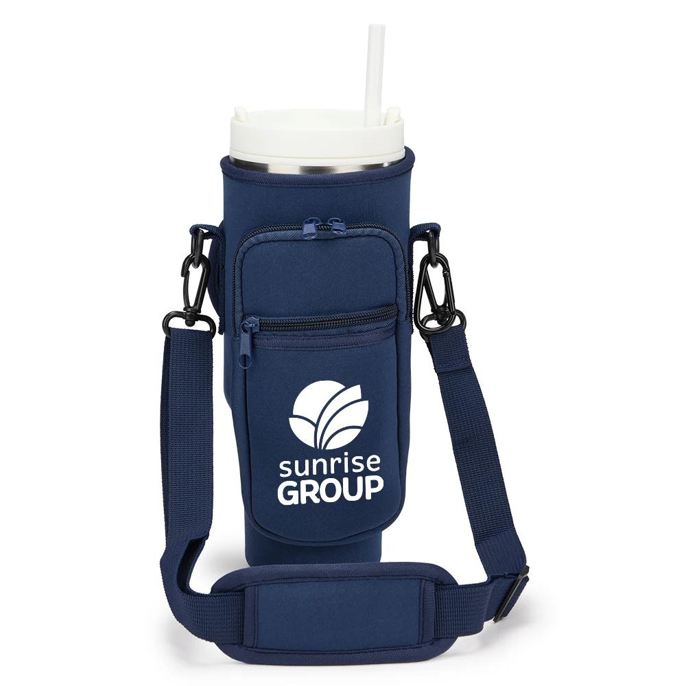 Personalized Tumbler Bag: Quality neoprene with Velcro® closure holds a standard 30-/40-oz. tumbler, with or without handle; Neoprene keeps hot or cold beverage at optimal temperature longer while protecting tumbler; 2 zippered pockets for a smartphone, cash, IDs, and more; Padded, adjustable, detachable shoulder strap for carrying over the shoulder or across the body; Carabiner clip for attaching keys