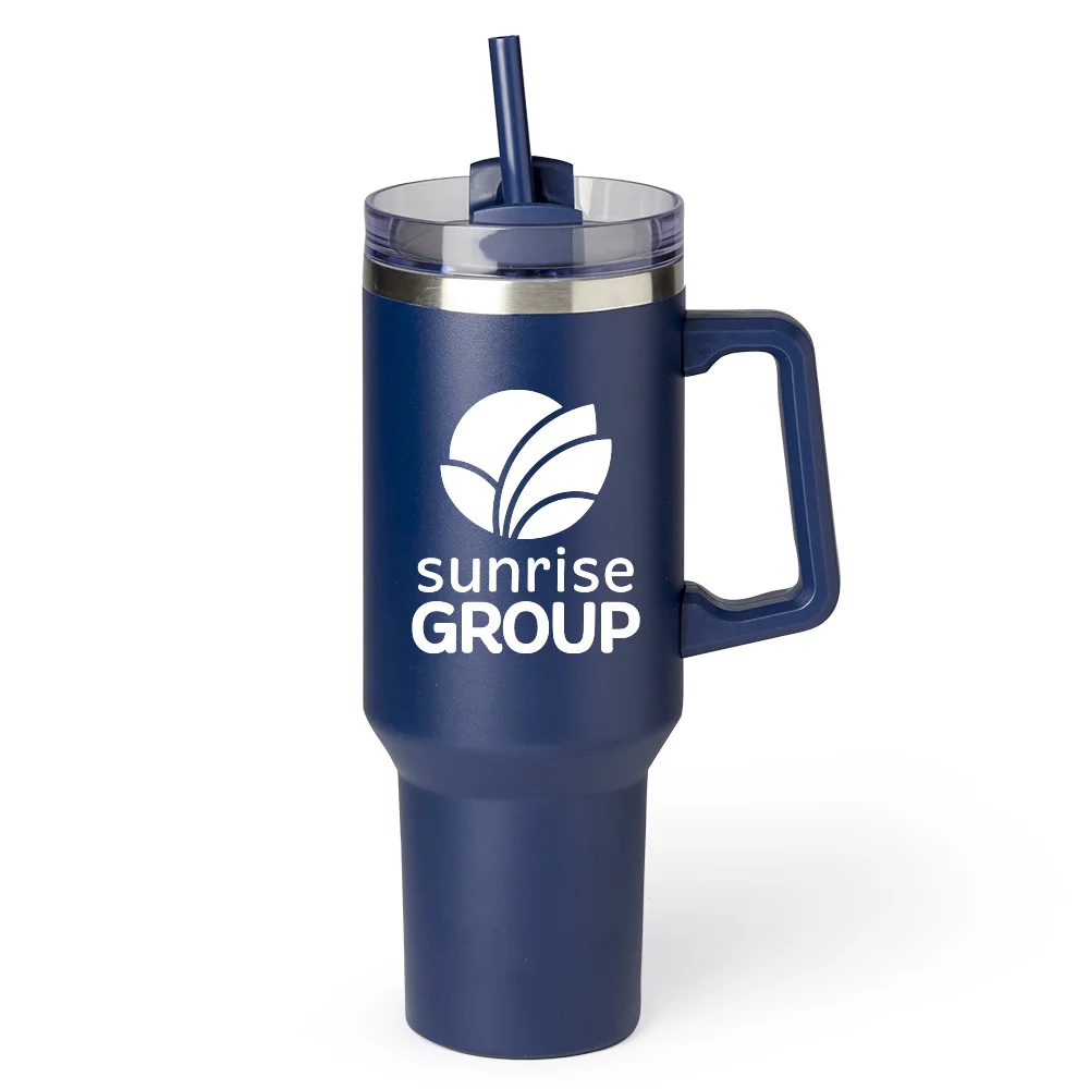 Personalized 40-oz. Tumbler: Go big: hydrate (or caffeinate) to the max; Double-walled stainless-steel construction; Vacuum insulated; Keeps beverages cold for 11 hours (2 days with ice) or hot for 7 hours; Matte, powder-coated finish prevents condensation; Splash-resistant, screw-on, 3-position rotating lid: Straw opening; Reusable straw included, sip-through opening, & fully sealed; Big, sturdy handle to grip, sip, and gulp on the go; Tapered base fits most car cup holders; Eco friendly; Reusable; Durable gift box included; Note: Dishwasher safe