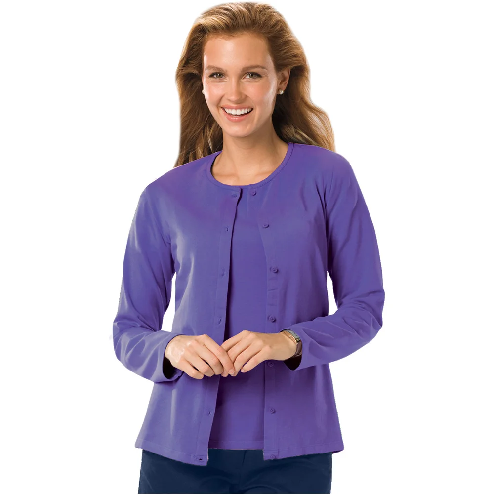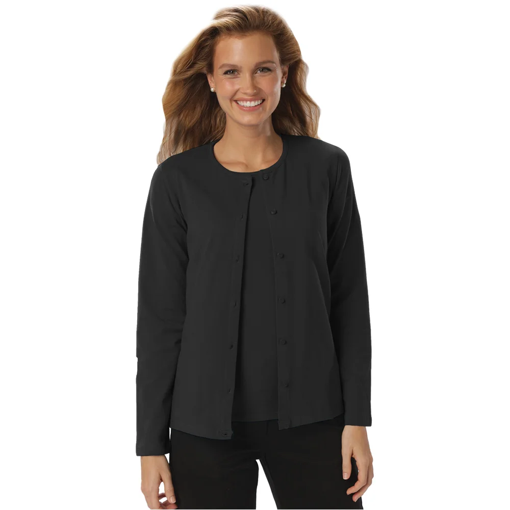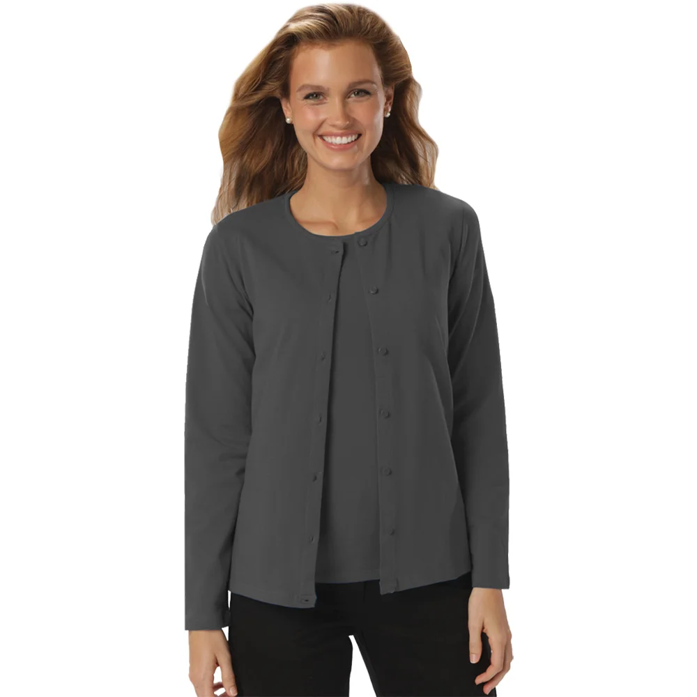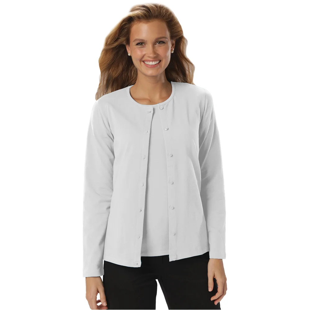 • Make a fashion-forward addition to your wardrobe with this ladies 6.5 oz. jersey long-sleeve button-front cardigan
