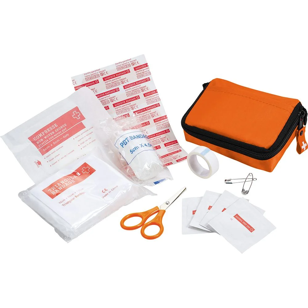 * The Bolt 20-Piece First aid kit is a travel pack that includes 5 adhesive bandages 4 alcohol pads paper tape roll 2 safety pins 5 gauze pads 1 gauze roll 1 triangular bandage and scissors in case Belt loop on back of pouch for easy attachment on the go Meets FDA requirements