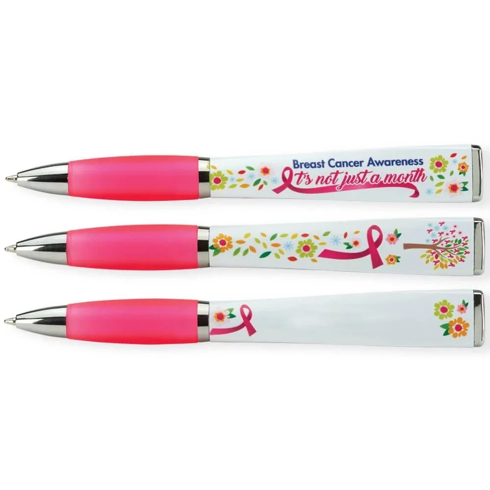 Maximize breast cancer awareness: our exclusive Breast Cancer Awareness: It's Not Just A Month floral design on two sides of the pen, with your custom imprint on the third side