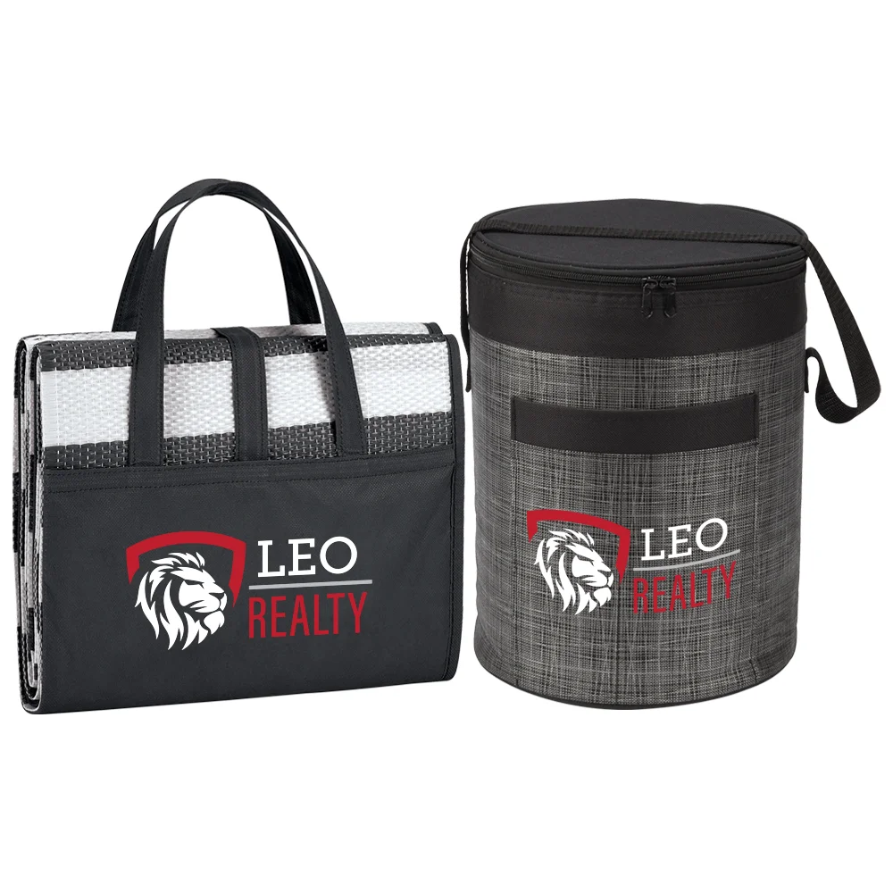 2-piece gift set includes: Brookville Barrel Cooler Bag & Beach Mat