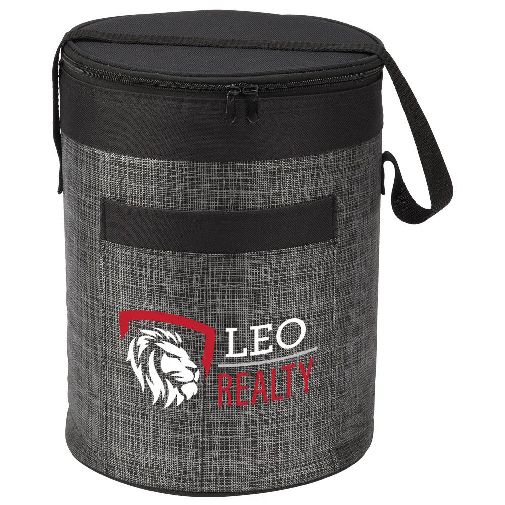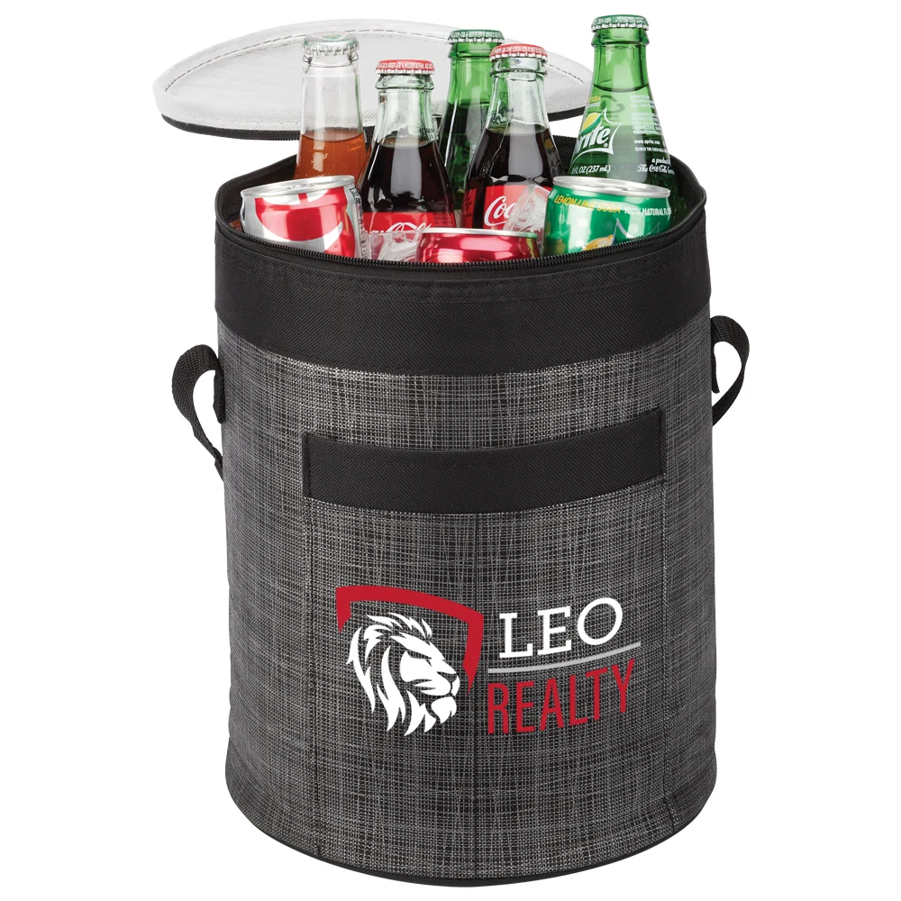 Personalized Cooler Bag: Roomy, zip-shut, barrel-shaped, insulated cooler; Holds up to 16 cans plus ice; Exterior pocket for napkins and quick-grab items; 19 1/2" carry strap; Folds flat for easy storage; 80gsm non-woven polypropylene/600-denier polyester trim