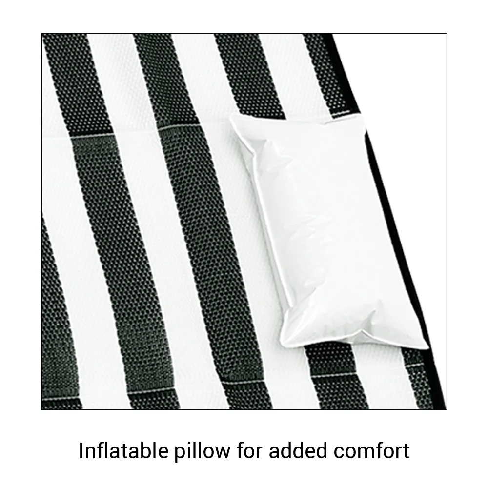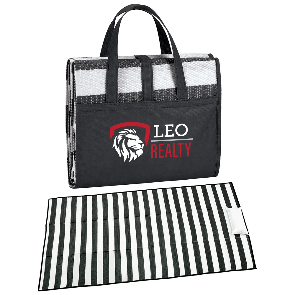 Personalized Beach Mat: Bask in the sun in style and comfort; Perfect for a day at the beach or a picnic in the park; Water- and sand-resistant mat unrolls to 6 feet; Comes with an inflatable pillow for added comfort; Polypropylene with self-attached, non-woven cloth cover; Portable; Easily folds into a convenient case with 17" carry handles for storage and transportation