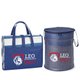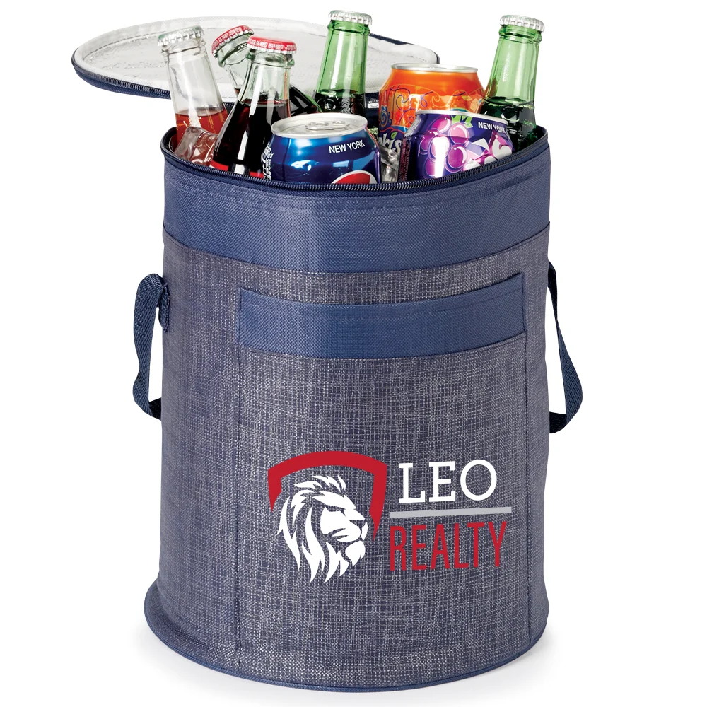 Personalized Cooler Bag: Roomy, zip-shut, barrel-shaped, insulated cooler; Holds up to 16 cans plus ice; Exterior pocket for napkins and quick-grab items; 19 1/2" carry strap; Folds flat for easy storage; 80gsm non-woven polypropylene/600-denier polyester trim