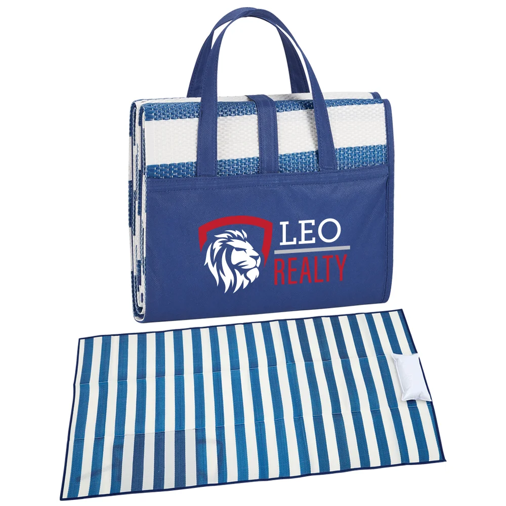 Personalized Beach Mat: Bask in the sun in style and comfort; Perfect for a day at the beach or a picnic in the park; Water- and sand-resistant mat unrolls to 6 feet; Comes with an inflatable pillow for added comfort; Polypropylene with self-attached, non-woven cloth cover; Portable; Easily folds into a convenient case with 17" carry handles for storage and transportation