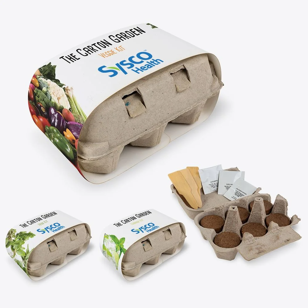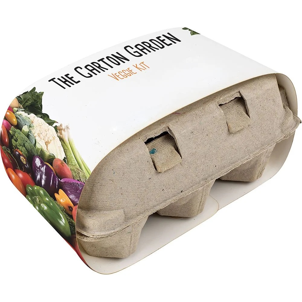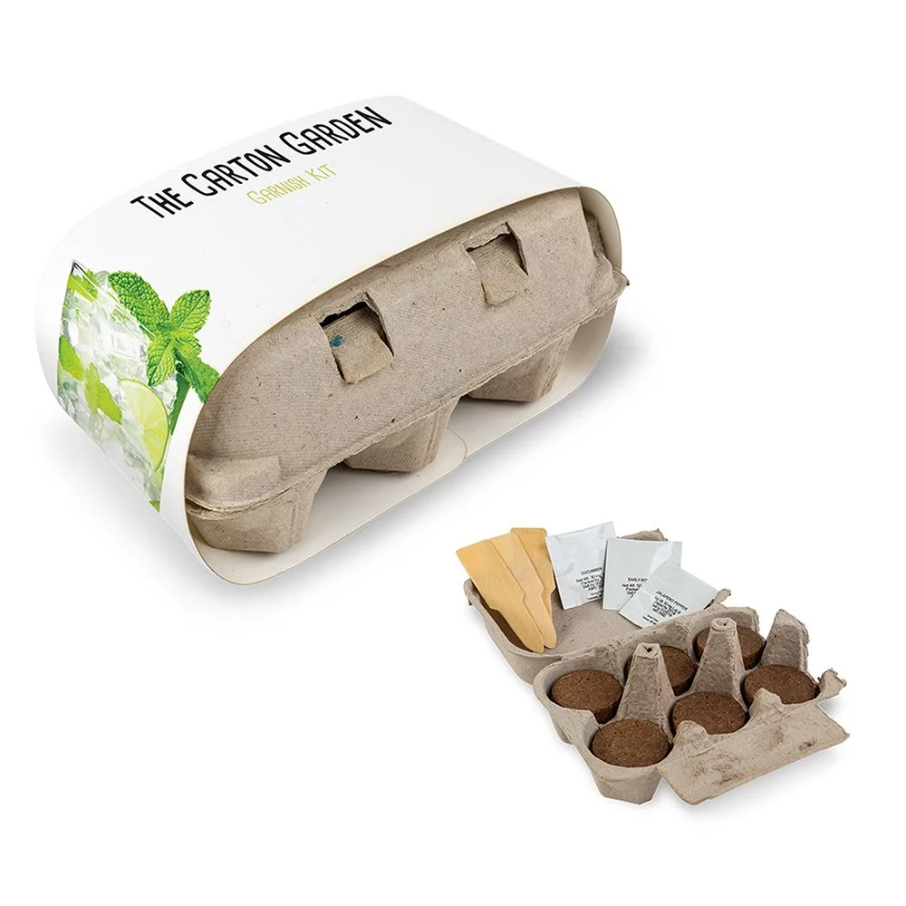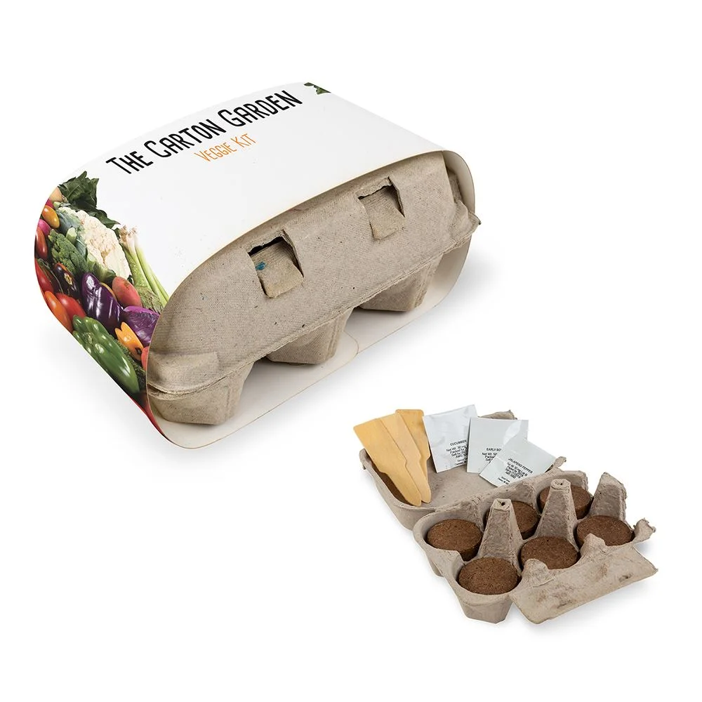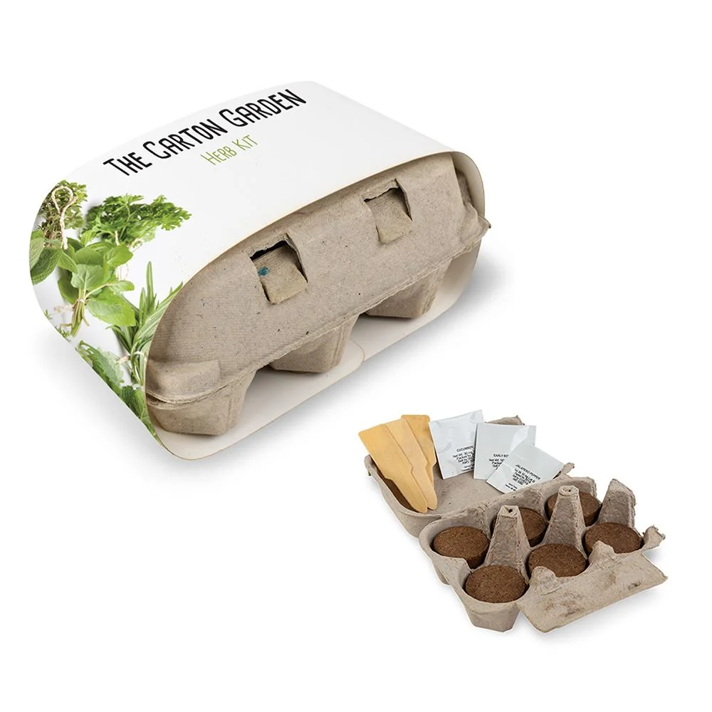 The Carton Garden includes 3 types of seeds, 6 starter soil pods, 3 blank wooden seed stakes to organize your plants, and packaged inside an egg carton made from recycled pulp
