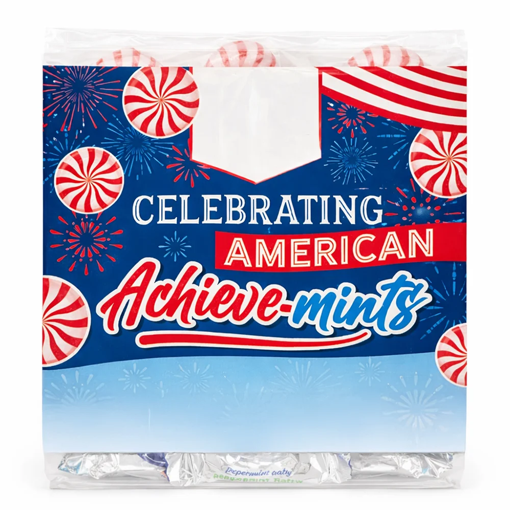 Card lists 8 Great American Achieve-mints, such as singing the Declaration of Independence, founding the American Red Cross, creating the World Wide Web, and 5 more