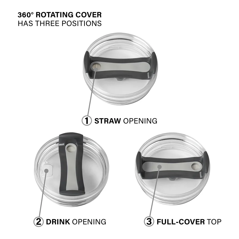 • Splash-resistant, screw-on, 3-position rotating lid: