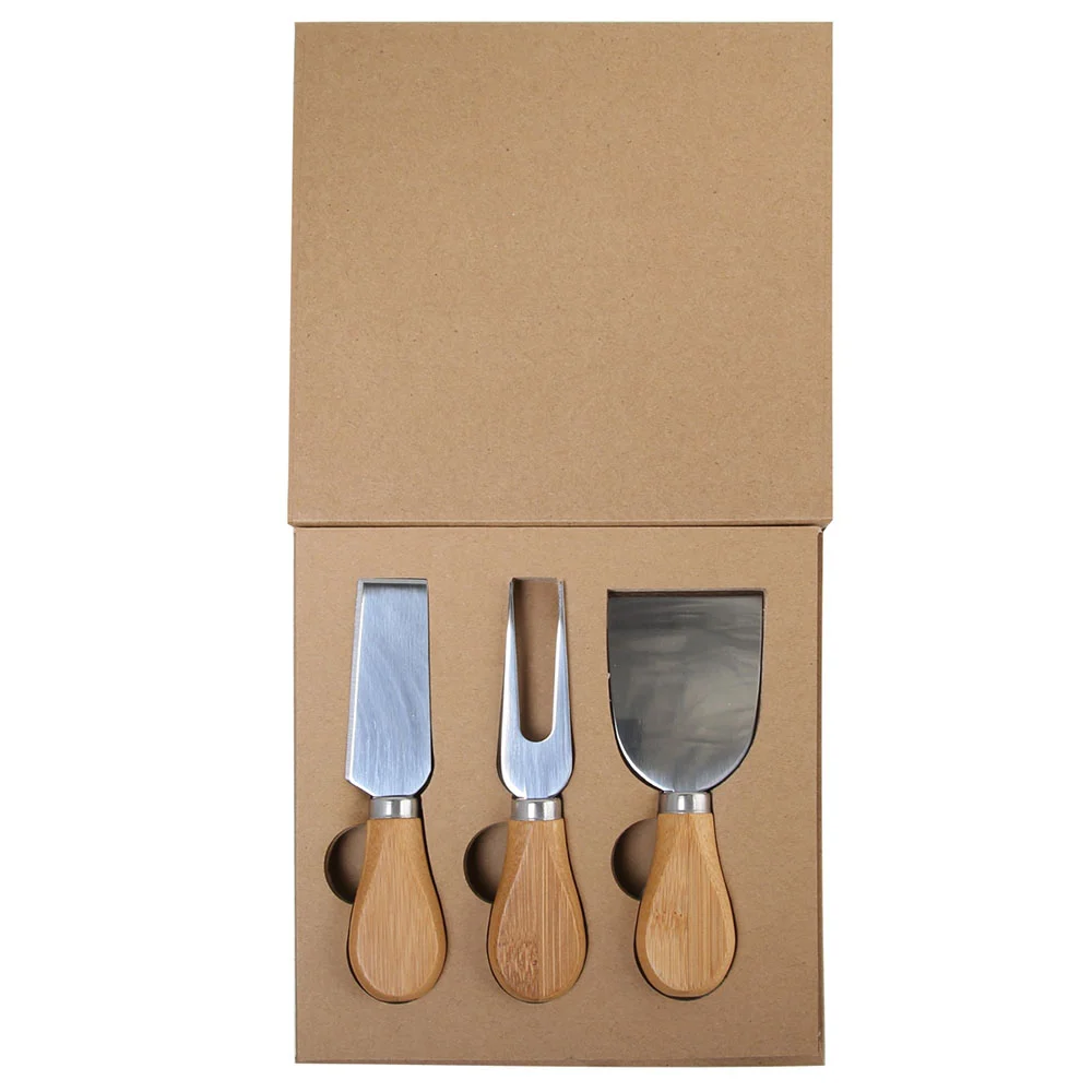 This three piece cheese knife set includes a narrow plane knife, acheese fork and a flat cheese knife