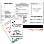 Each kit includes: pre-inked fingerprint strip, area for photo and personal/physical information, space to include medical information, area for a DNA sample and a dental chart