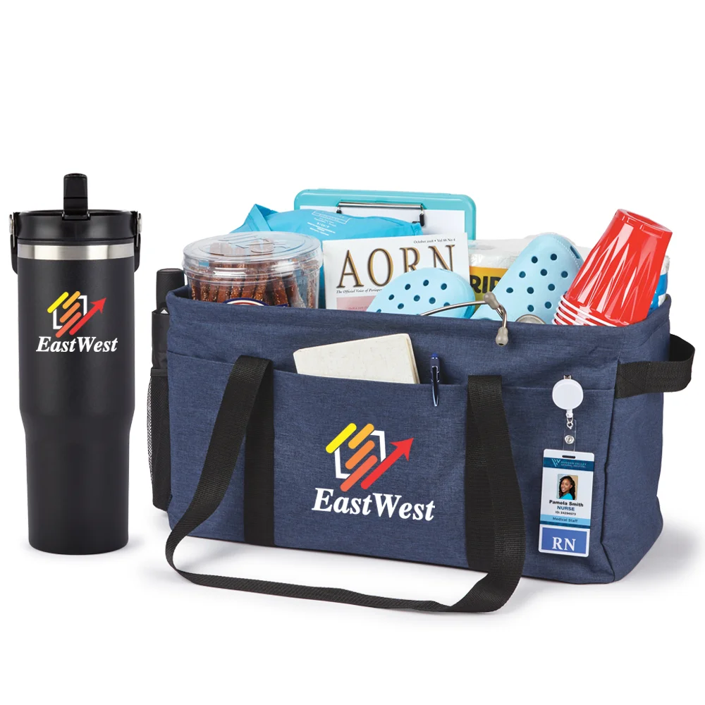 2-piece gift set includes: Coldflow Double-Wall Flip-Straw Bottle 30 oz. With Carry Handle & 2-in-1 Bring-It-All Jumbo Utility Tote & Organizer