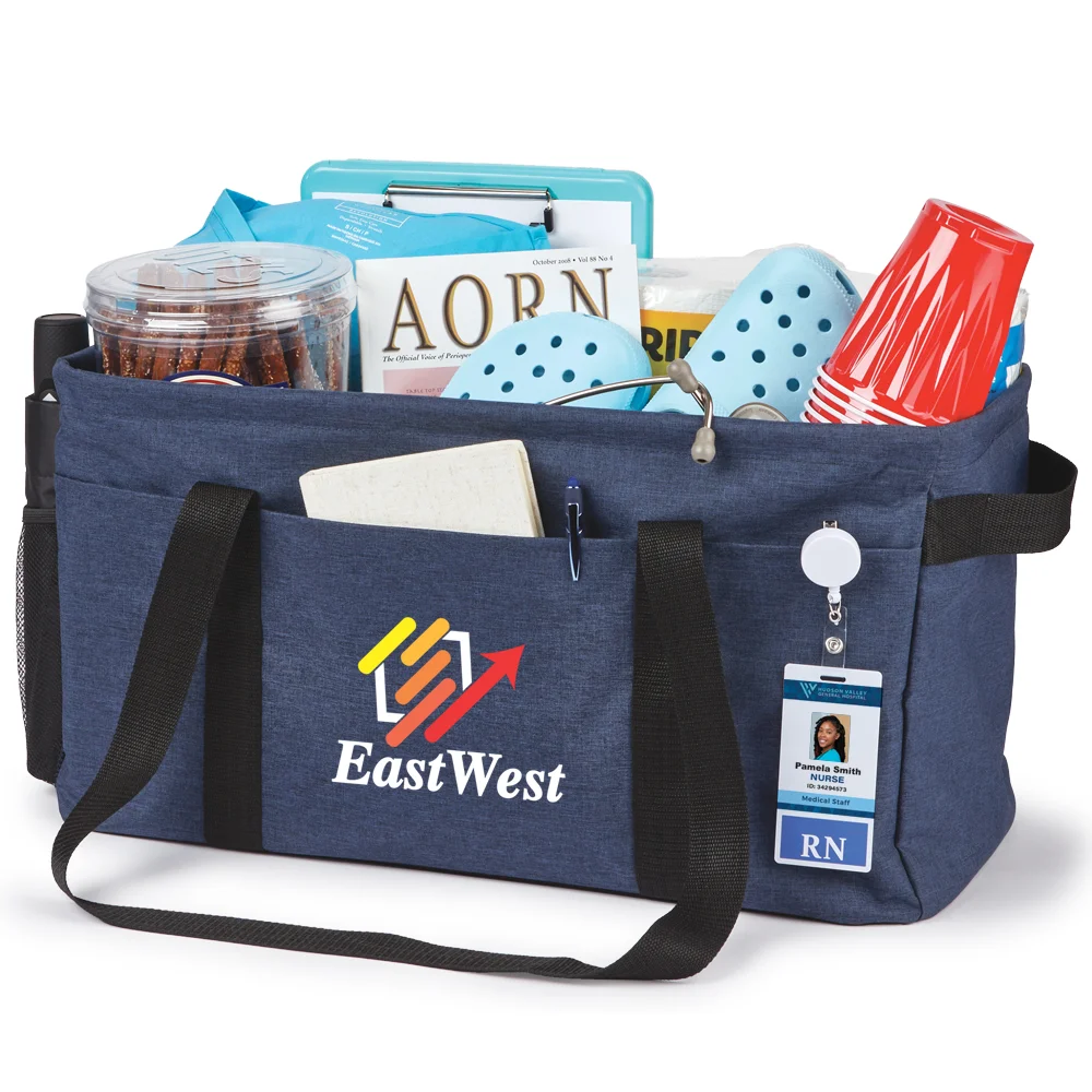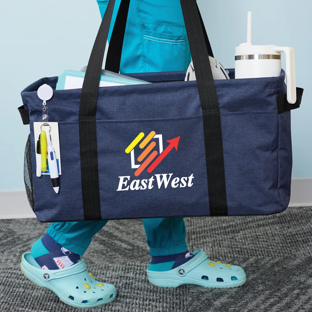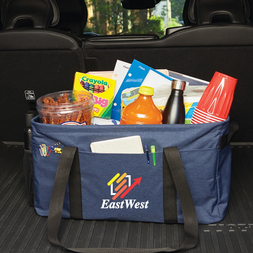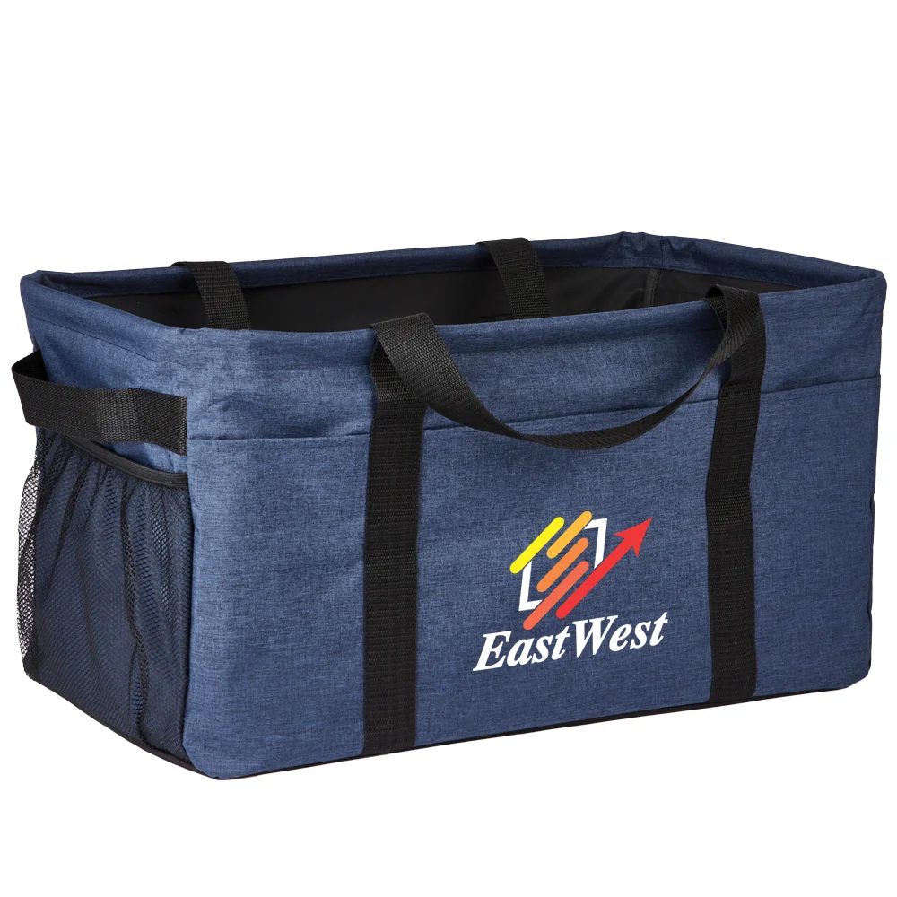 Personalized Utility Tote: Unlimited versatility: tote big loads on the go or use as a storage bin or closet organizer; Extra-large compartment with wire support to hold shape; Hard bottom for stability; 3 front pockets and mesh side pocket transport even more; Convenient carry: long straps AND grab handles on each end; Collapses for space-saving storage; 600-denier polyester & 300-denier heathered polyester