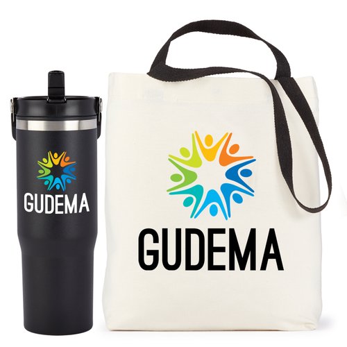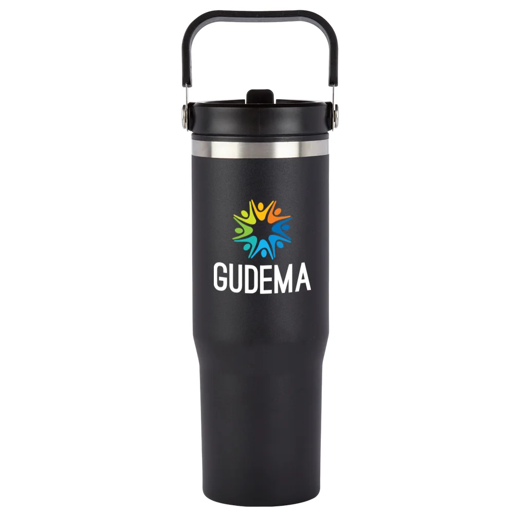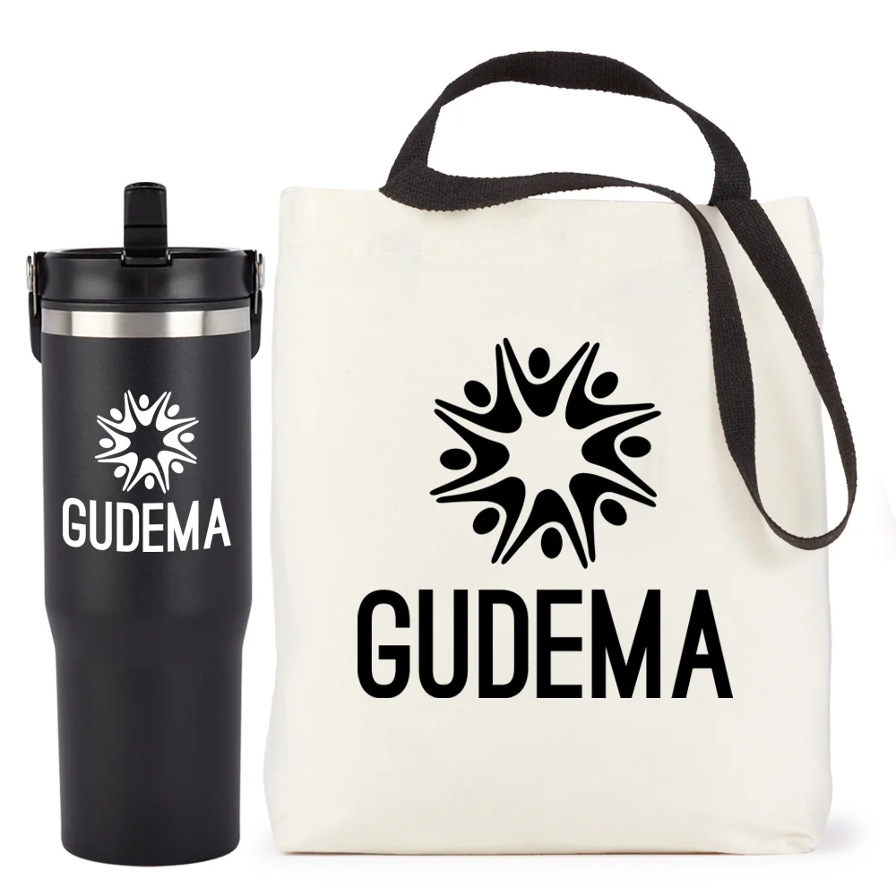 2-piece gift set includes: Coldflow Double-Wall Flip Straw Bottle 30 oz. With Carry Handle & Venice Dual Carry Handle Reusable Cotton Tote Bag