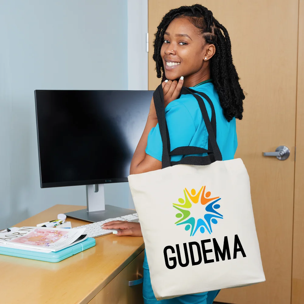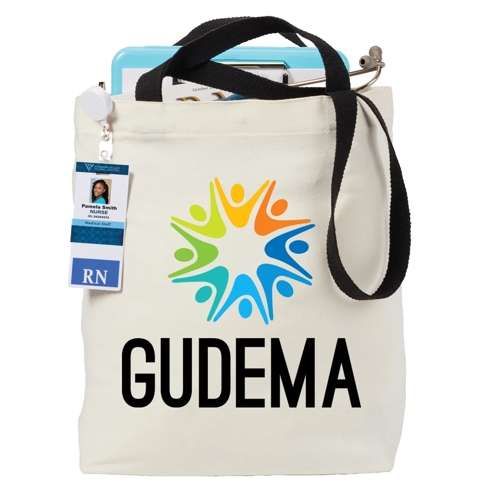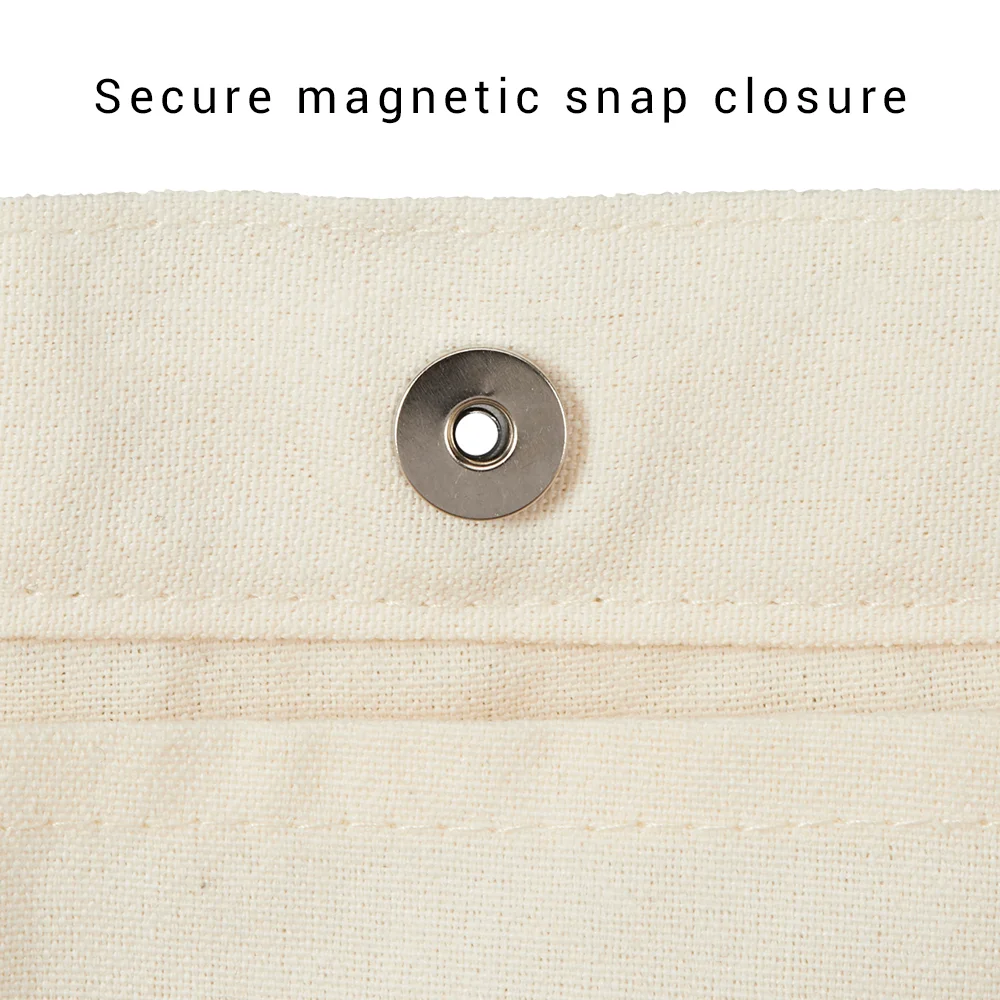 Personalized Cotton Tote: Interior slip pocket holds phone or small accessories; Secure magnetic snap closure; Perfect for daily use, shopping, groceries, beach, and more; Multiple ways to carry: 28" shoulder straps for over the shoulder, 11 1/2" handles for in-hand carry; Durable, eco-friendly, 6-oz. cotton with contrasting handles; Machine washable