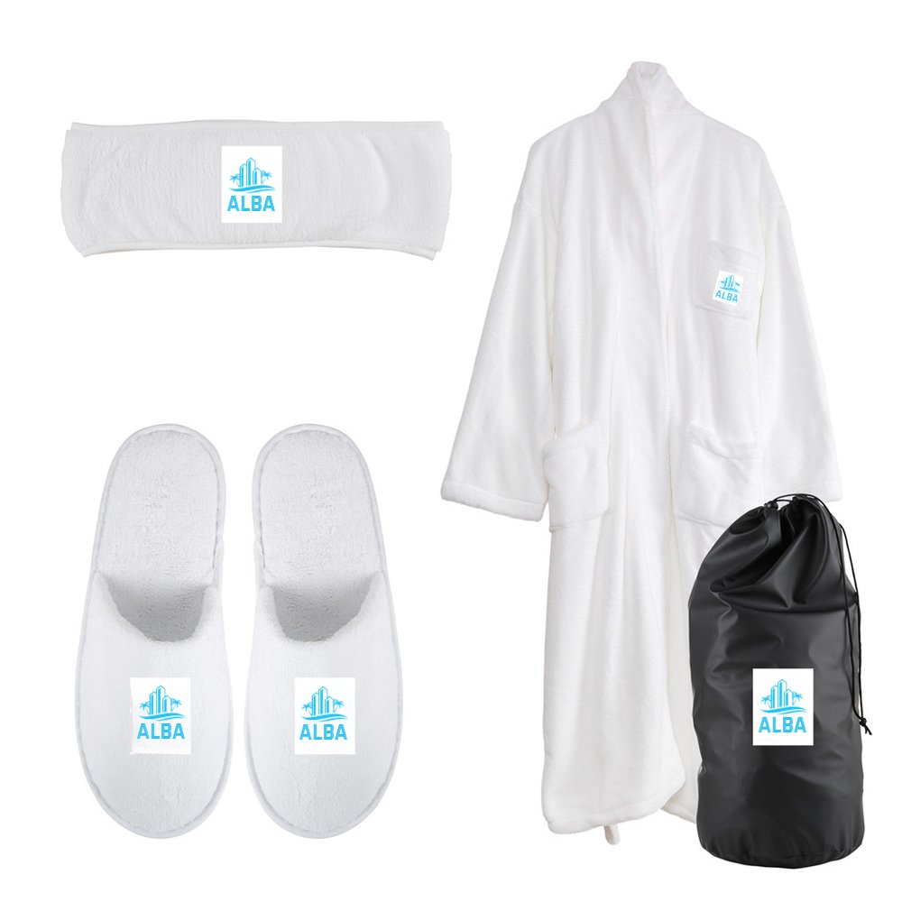Head Wrap: 6"W X 2"H, Slippers: 2.25"W X 2.25"H, Bag: 5"W X 5"H, Up To 3 Lines/Logo; 35 Characters Max Per Line