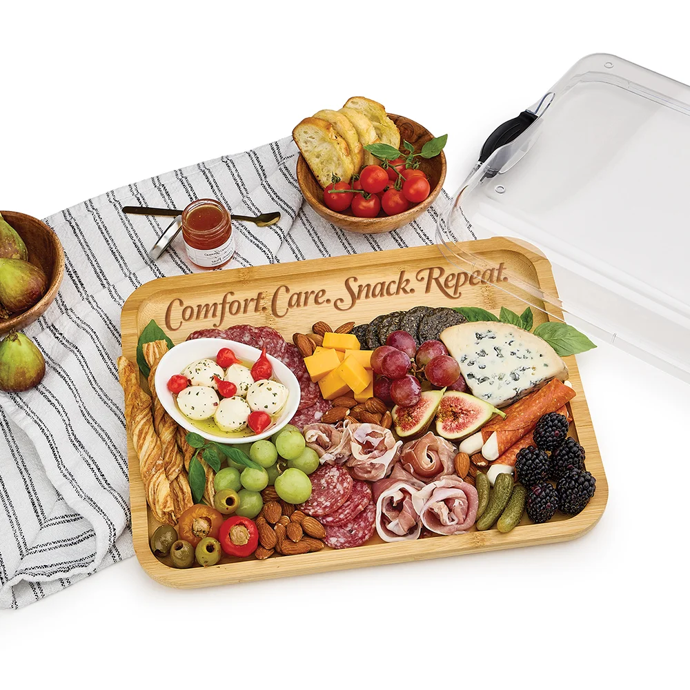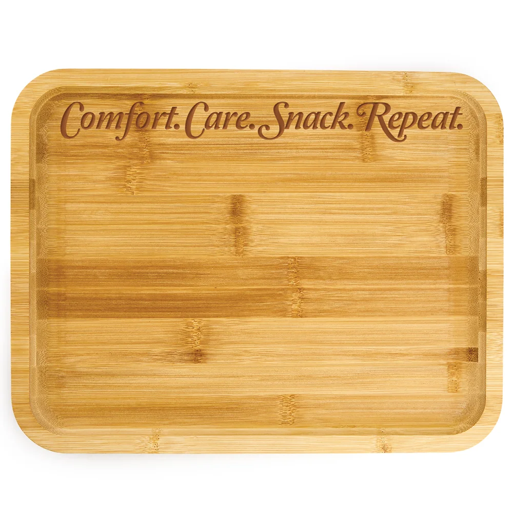 Laser-engraved exclusive Comfort. Care. Snack. Repeat. design at top
