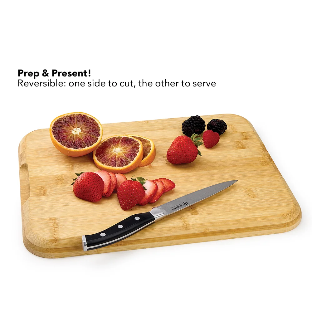 Durable, natural bamboo: smooth cutting surface on one side, flip over to serve