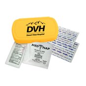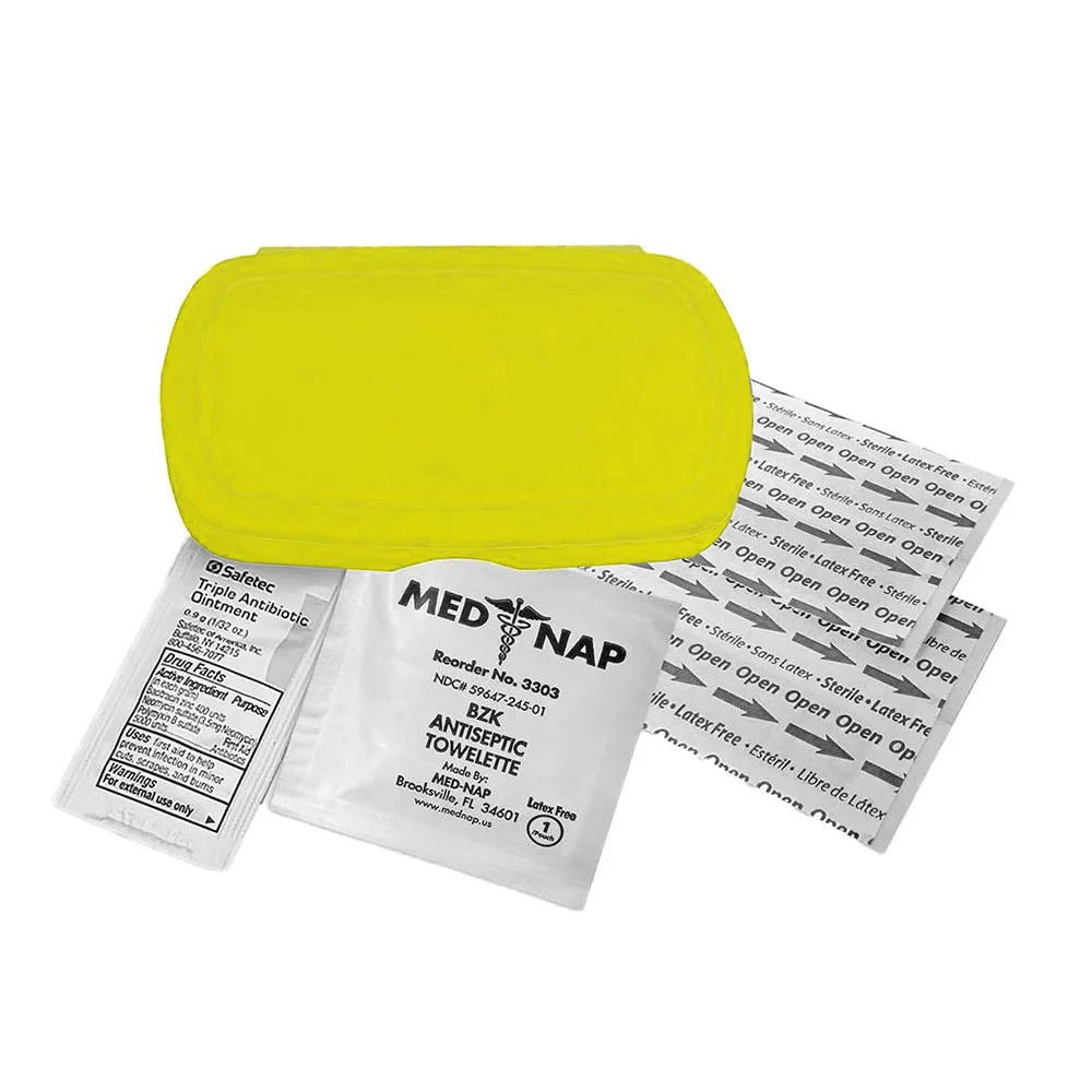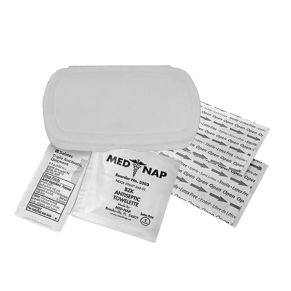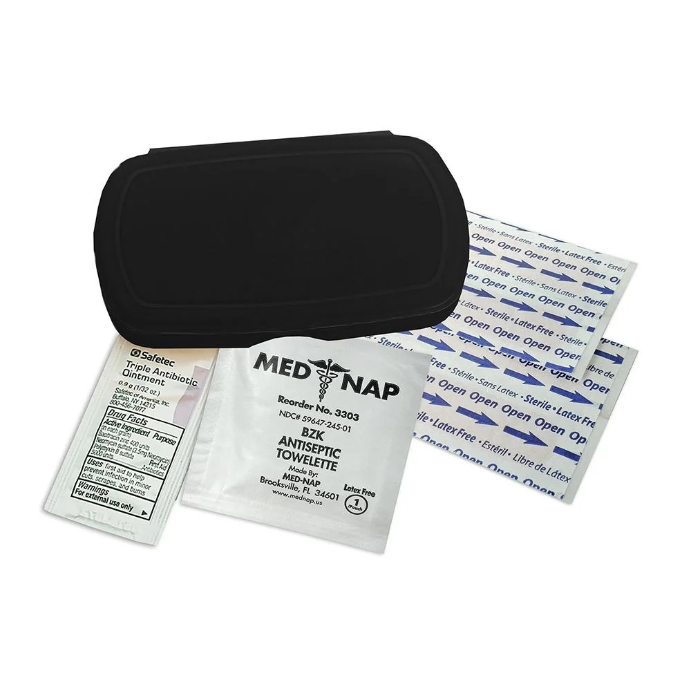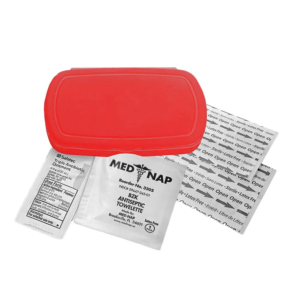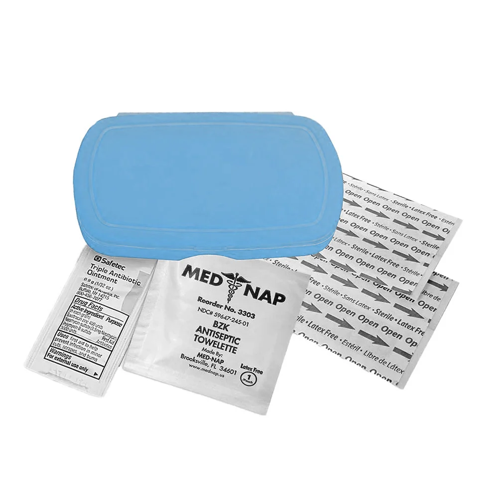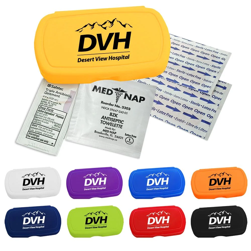 Oval design living hinge box is available in 9 colors, contains four latex-free adhesive bandages, one antiseptic towelette, one triple antibiotic ointment packet