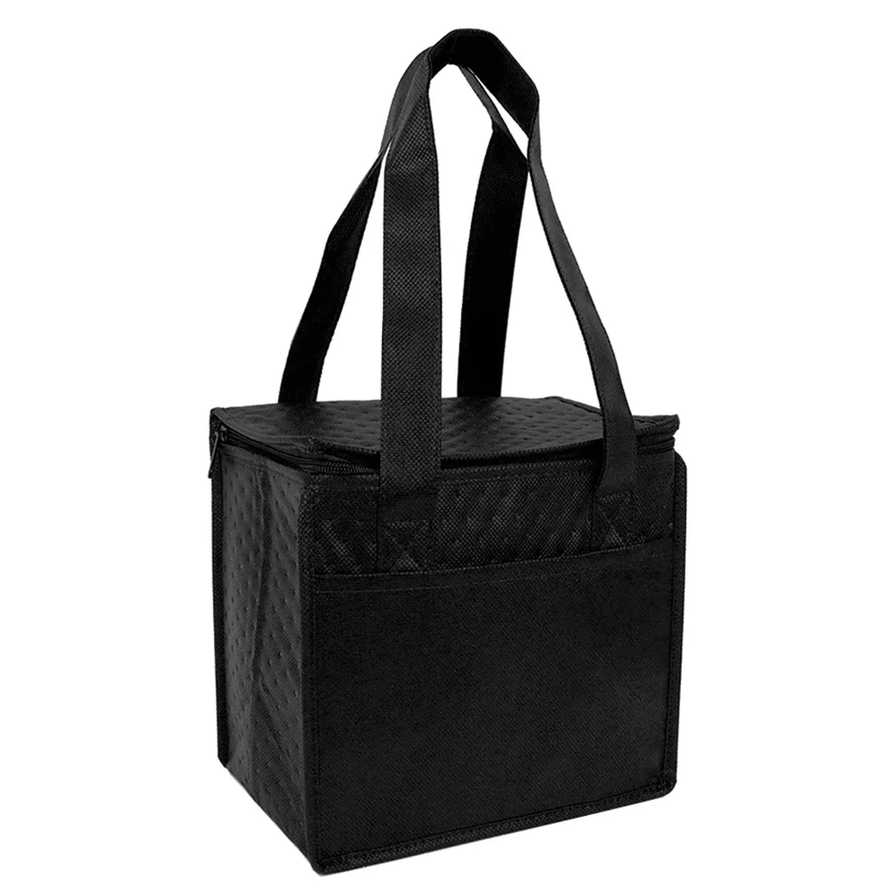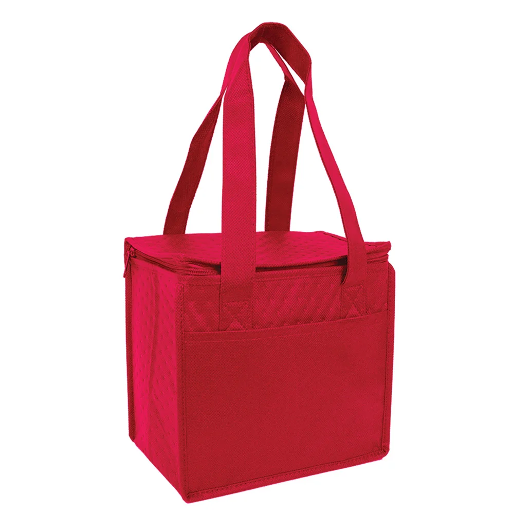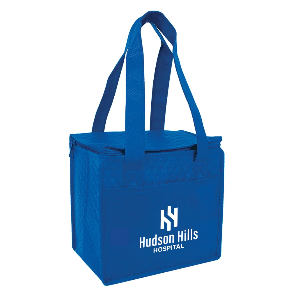 * Compact small hot/cold cooler tote with foil lining to keep food insulated & front open pocket. Includes drop-in board for support. Comes in 6 fabric colors with matching color handles. Imprint on front pocket only.