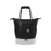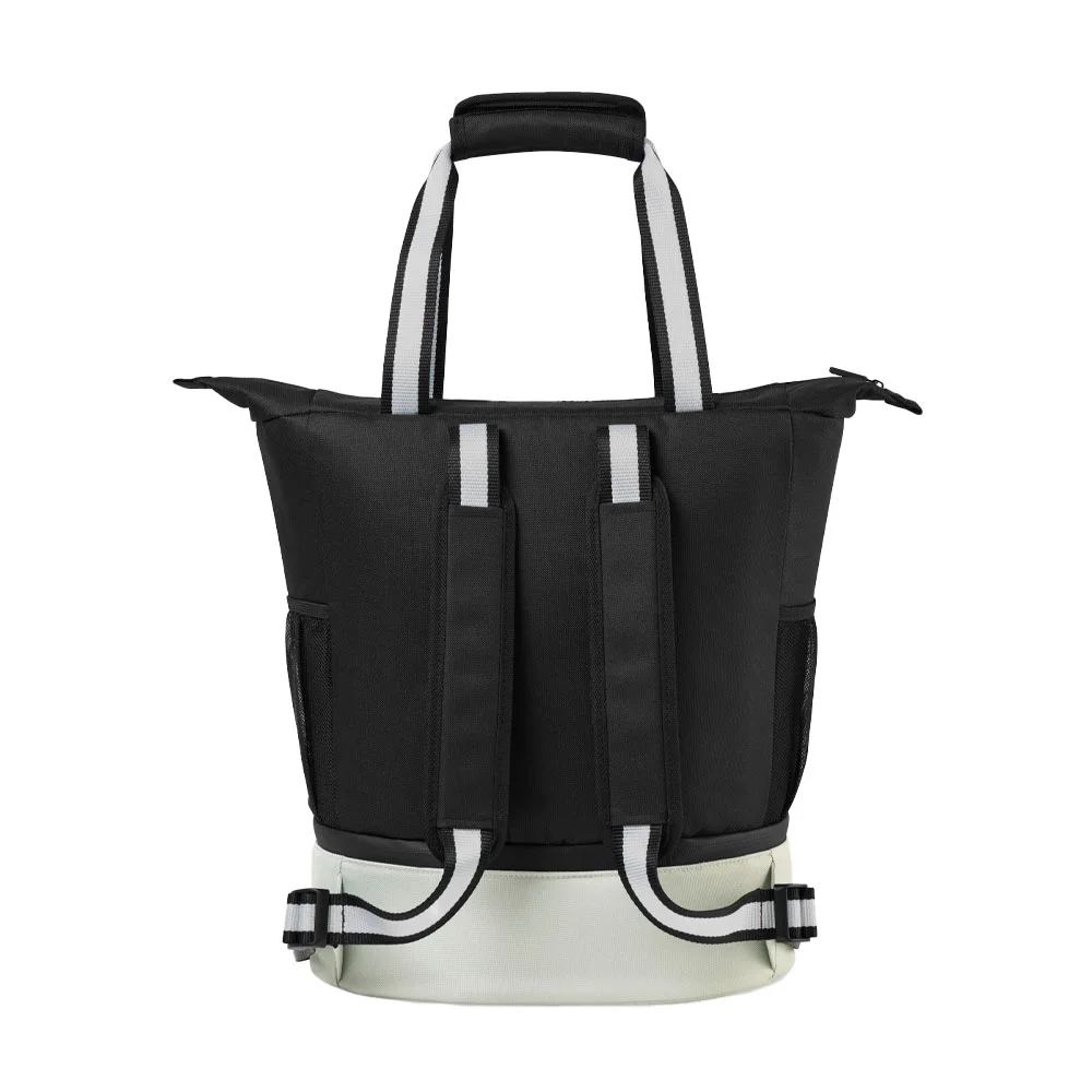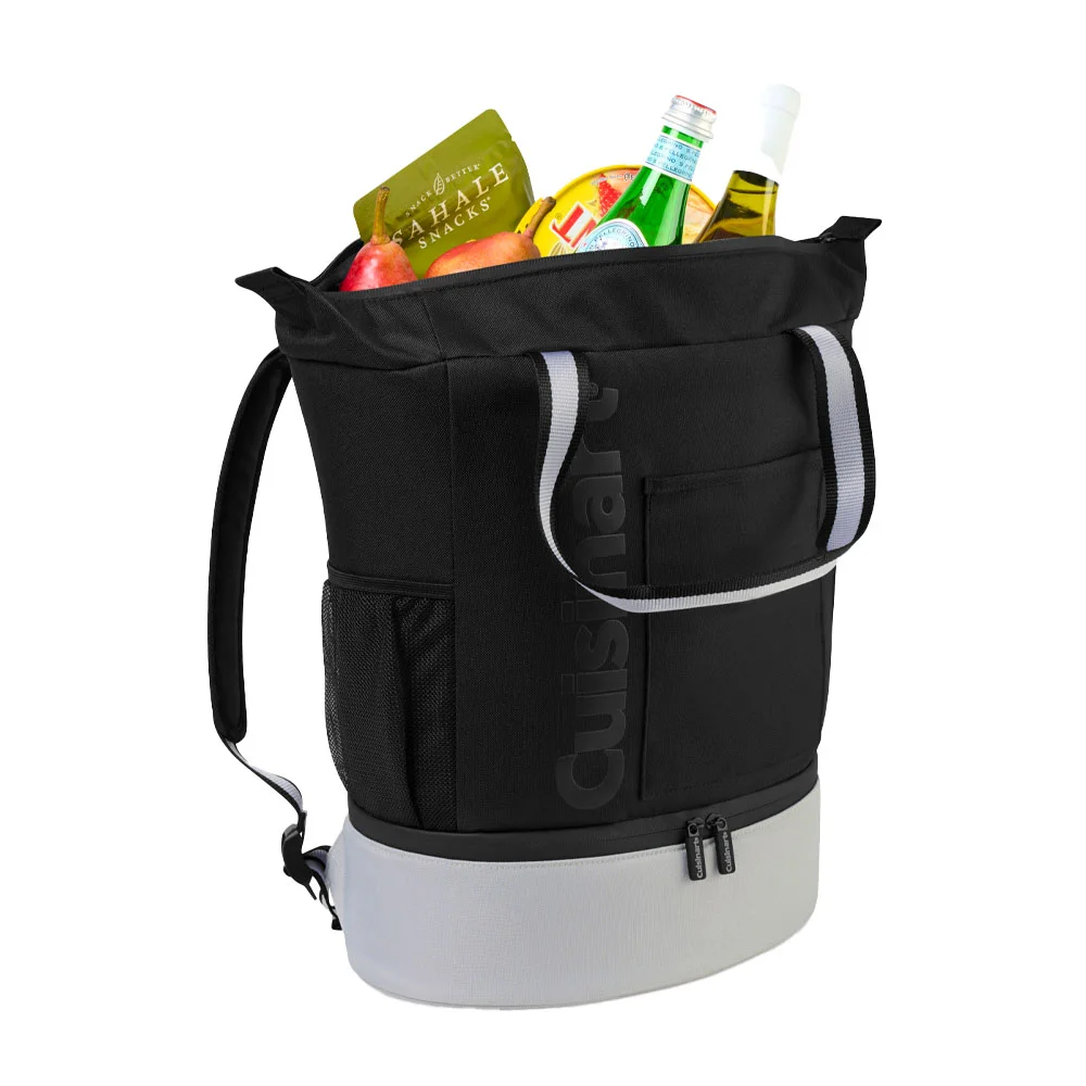 • This cooler functions as both a backpack or a tote with a divider that separates food and drinks