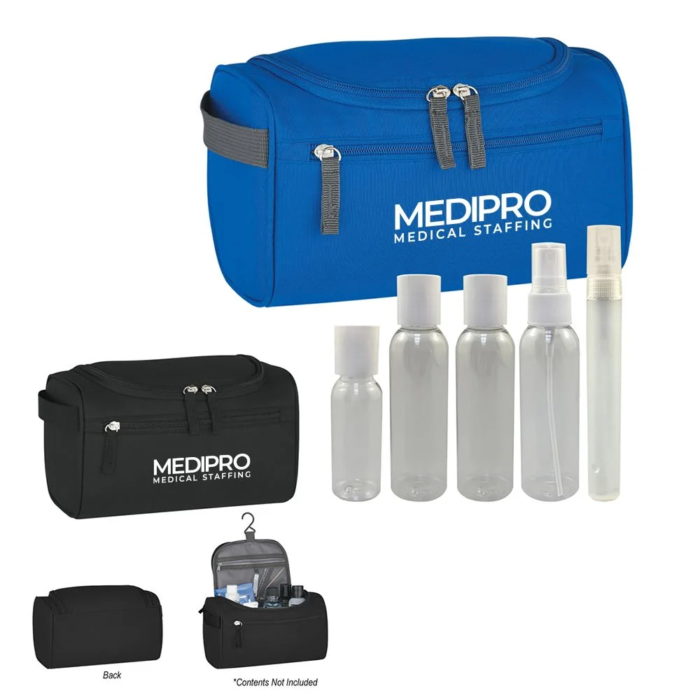 Set includes deluxe travel toiletry bag, .34 Oz. refillable spray bottle, 1 Oz. refillable bottle, 2 Oz. refillable bottle, and 2 Oz. refillable spray bottle