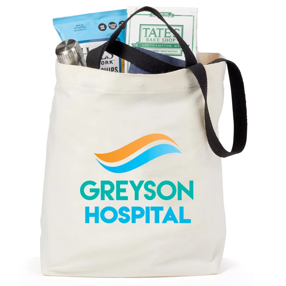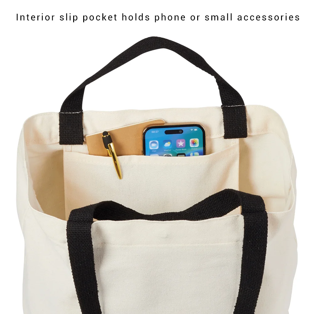 Personalized Cotton Tote: Interior slip pocket holds phone or small accessories; Secure magnetic snap closure; Perfect for daily use, shopping, groceries, beach, and more; Multiple ways to carry: 28" shoulder straps for over the shoulder, 11 1/2" handles for in-hand carry; Durable, eco-friendly, 6-oz. cotton with contrasting handles; Machine washable