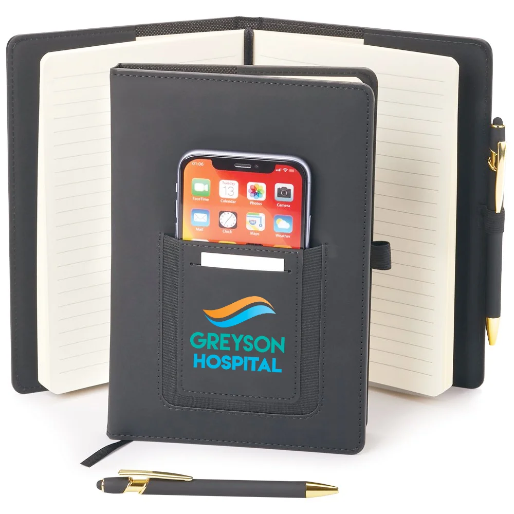 Personalized Refillable Journal: Hard cover made of padded, soft-touch vinyl with front business card pocket; Modern notebook keeps phone within reach, featuring an expandable phone pocket; Tuck loose notes into interior flaps; 80 lined pages; Notebook can be removed and refilled with a standard A5 notebook (not included); Ribbon bookmark & elastic pen loop; Metal stylus pen with rubberized finish and gold accents for jotting notes and navigating touchscreens; Black ink; Note: Pen remains blank