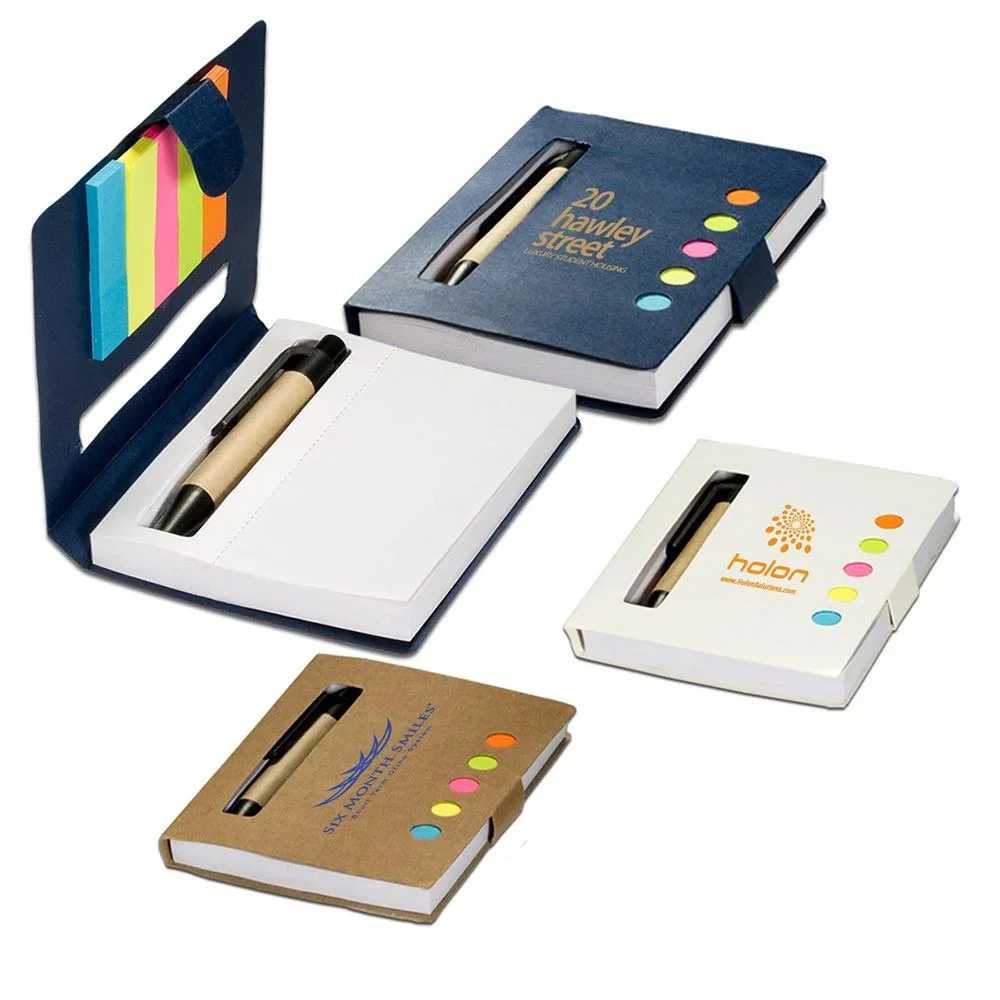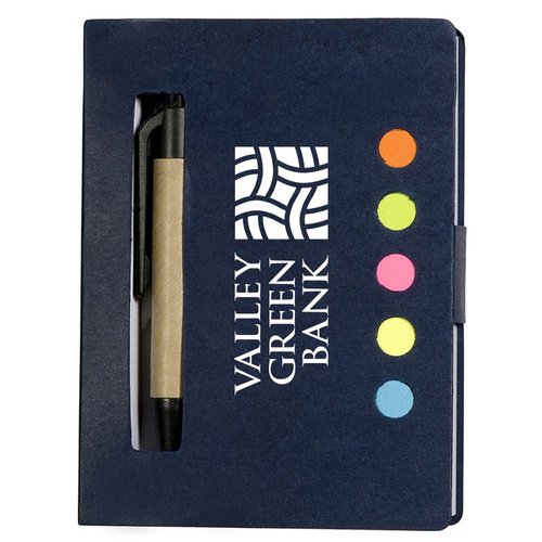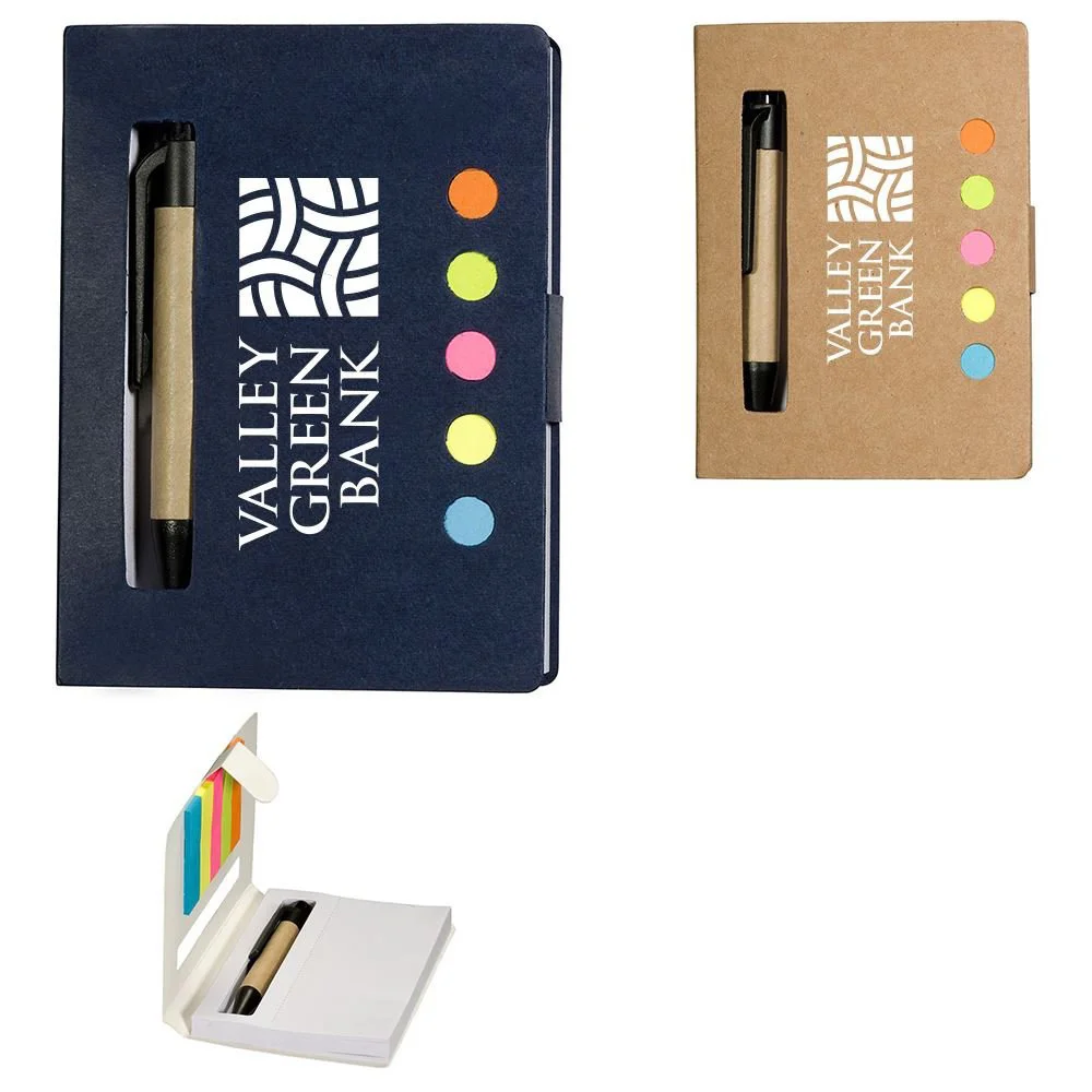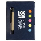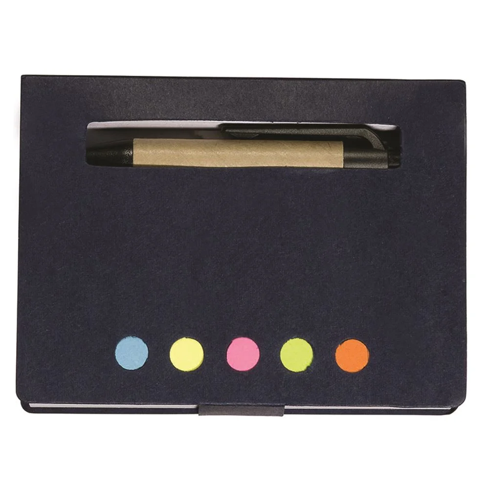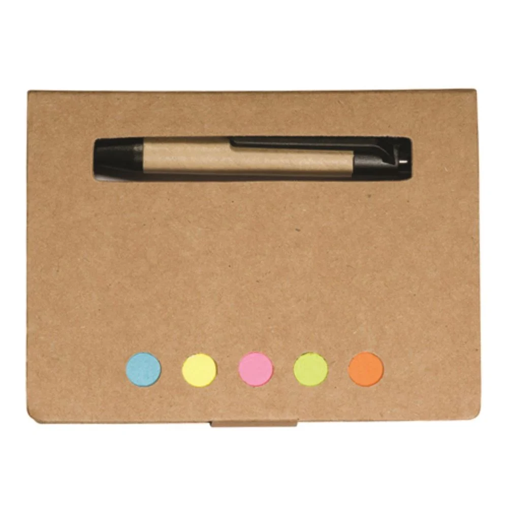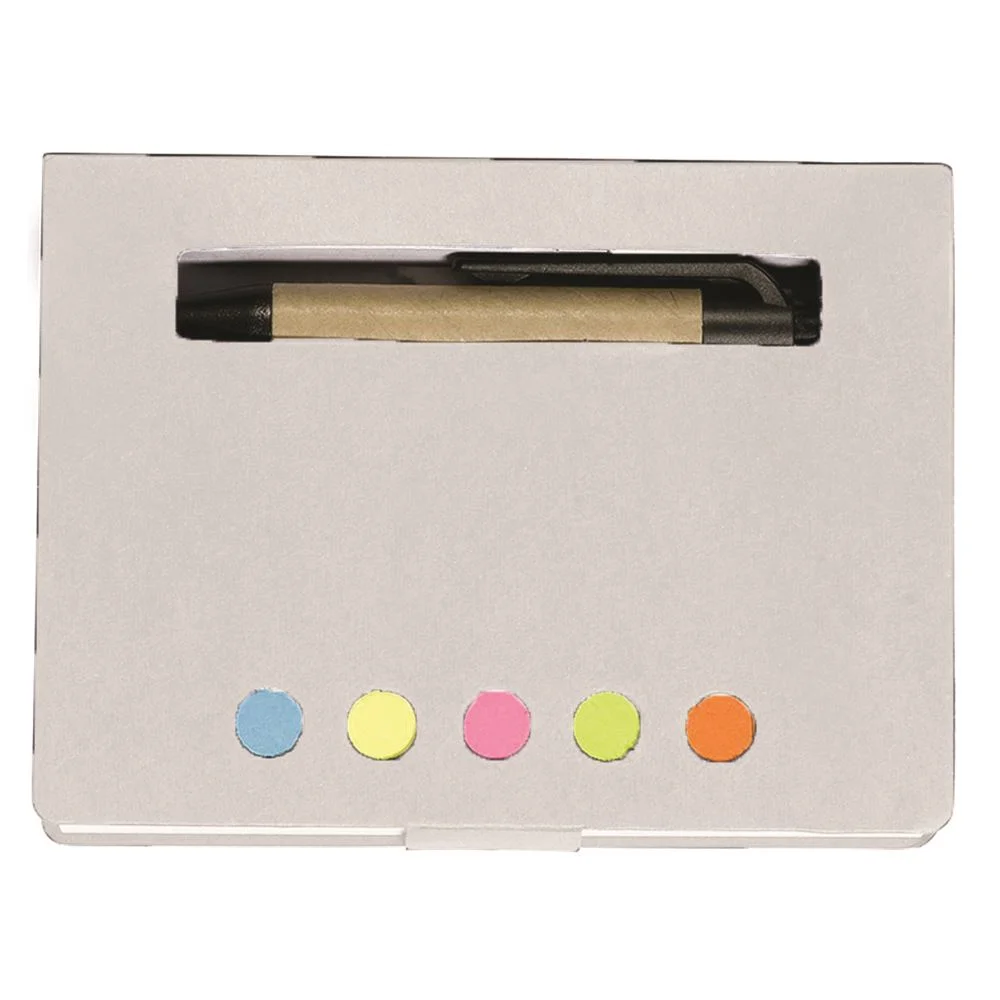 Includes five assorted neon sticky page flags, a 3" x 4"white perforated 80-sheet pad, and a mini paper barrel ballpoint pen in a recycled cardboard cover