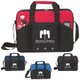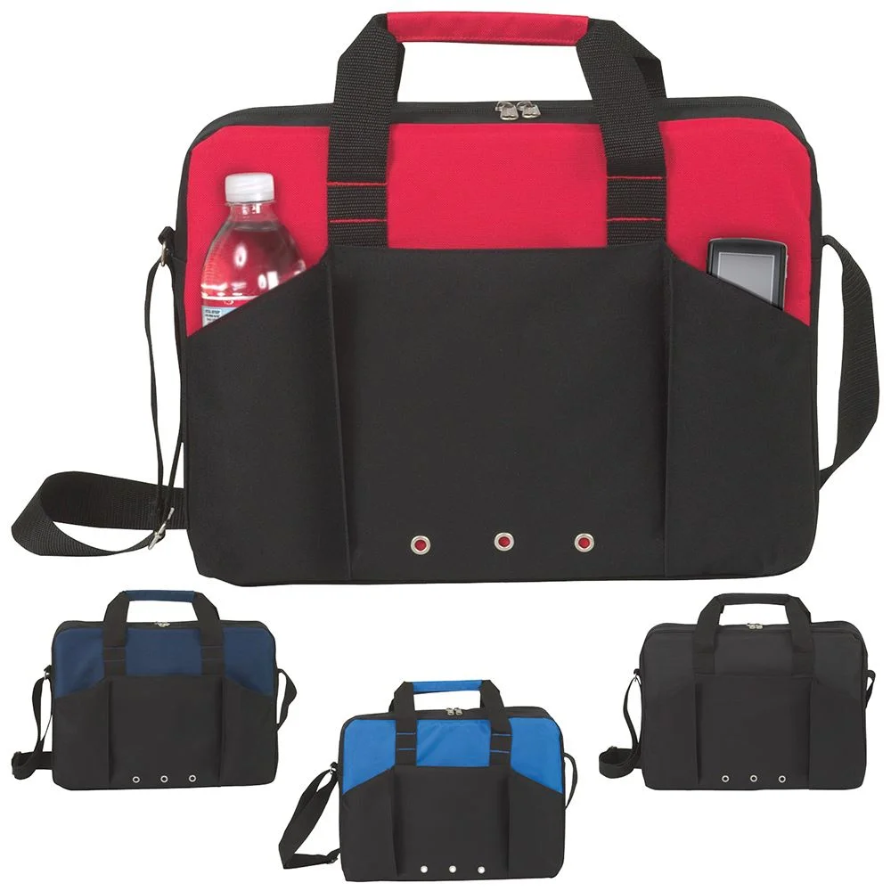Budget-friendly and stylish briefcase tote. Features dual gusseted pockets on the front for phone and water bottle, front pocket with inside organizer pockets, adjustable strap and fabric-wrapped handle grips.