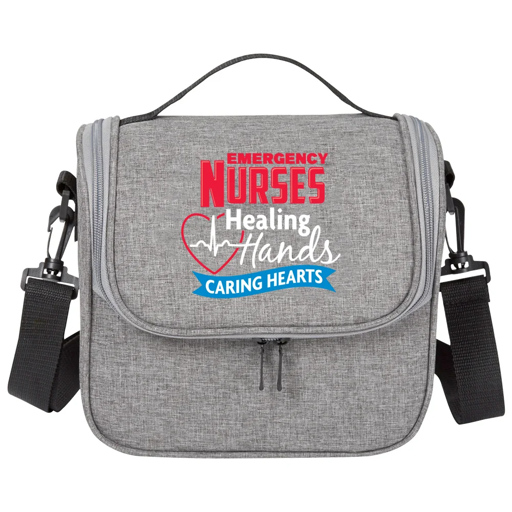 Portland Lunch/Cooler Bag: Dual-zip, leak-resistant compartment holds up to 6 cans with ice; Wipe-clean interior; Exterior slip pocket; Heathered 300-denier material; PEVA foam insulation; Adjustable, removable strap; Top carry handle; ID window