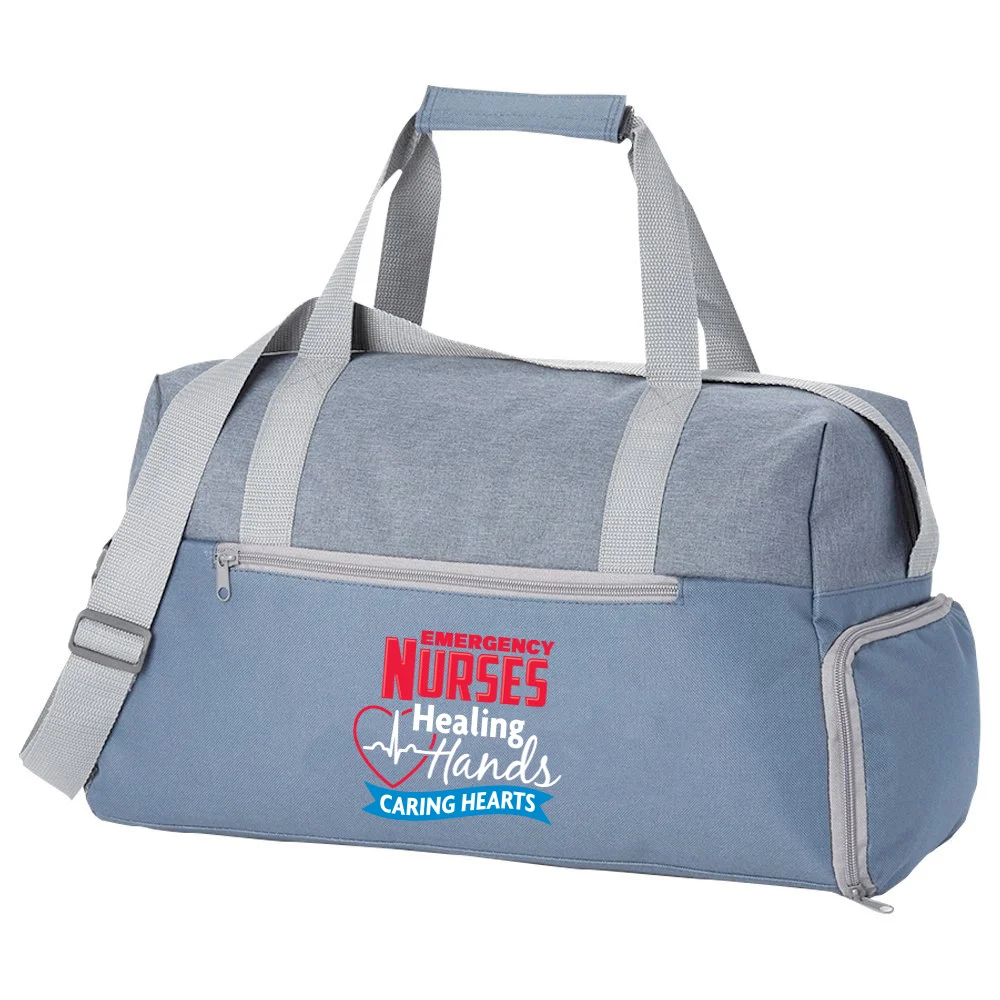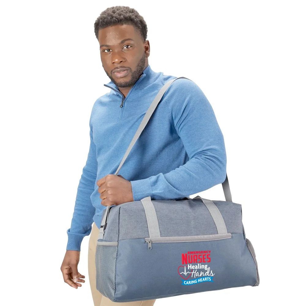 Ace Everyday Weekender Duffel Bag: Full-length, dual-zippered main compartment; Front zippered pocket; Large mesh pocket on one end; Dedicated side-entry zip compartment on the other end; Adjustable shoulder strap; Dual top grab handles; ID window on back; 9" gusset; Heathered 600-denier polycanvas